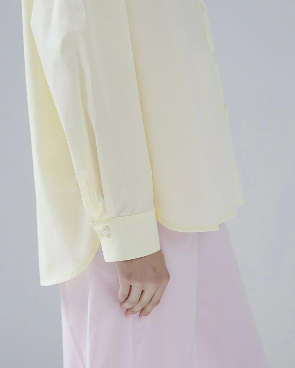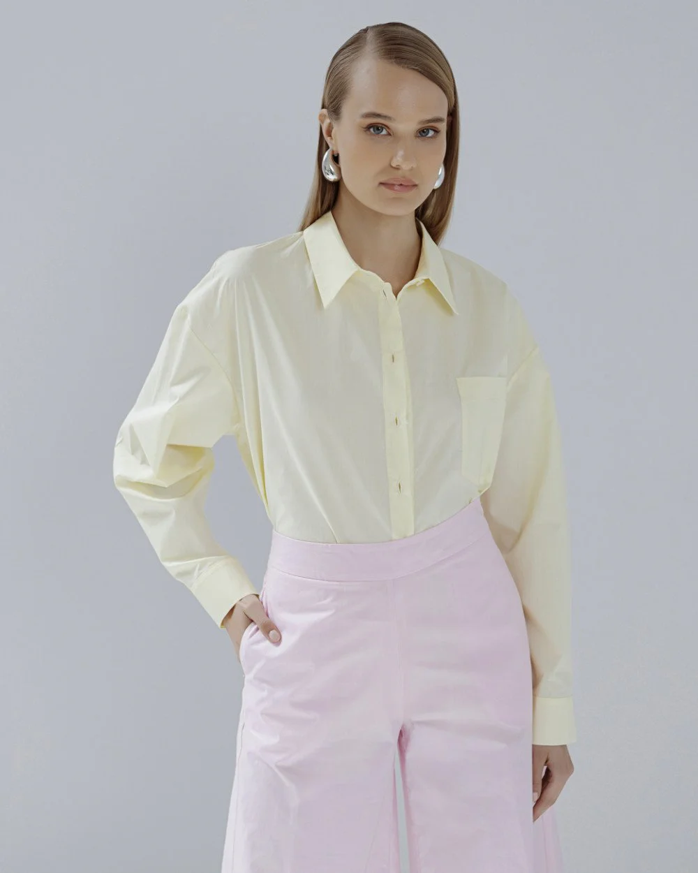 Cotton oversized shirt with a collar, long sleeves and a front patch pocket. Features side slits, a rounded hem and front and cuff button closure.