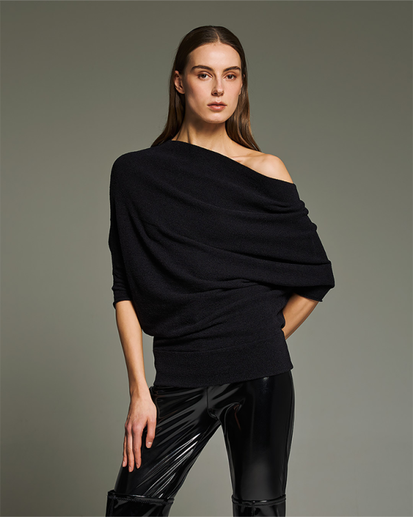 Off-shoulder knit sweater crafted in a soft knit fabric it drapes beautifully across the body, featuring wide short sleeves and a relaxed fit that enhances its contemporary silhouette. Perfect for pairing with leather pants or tailored trousers.