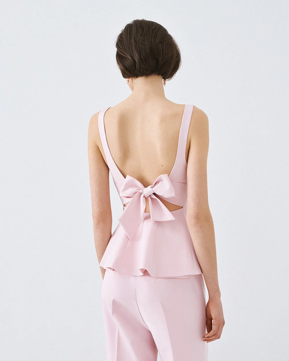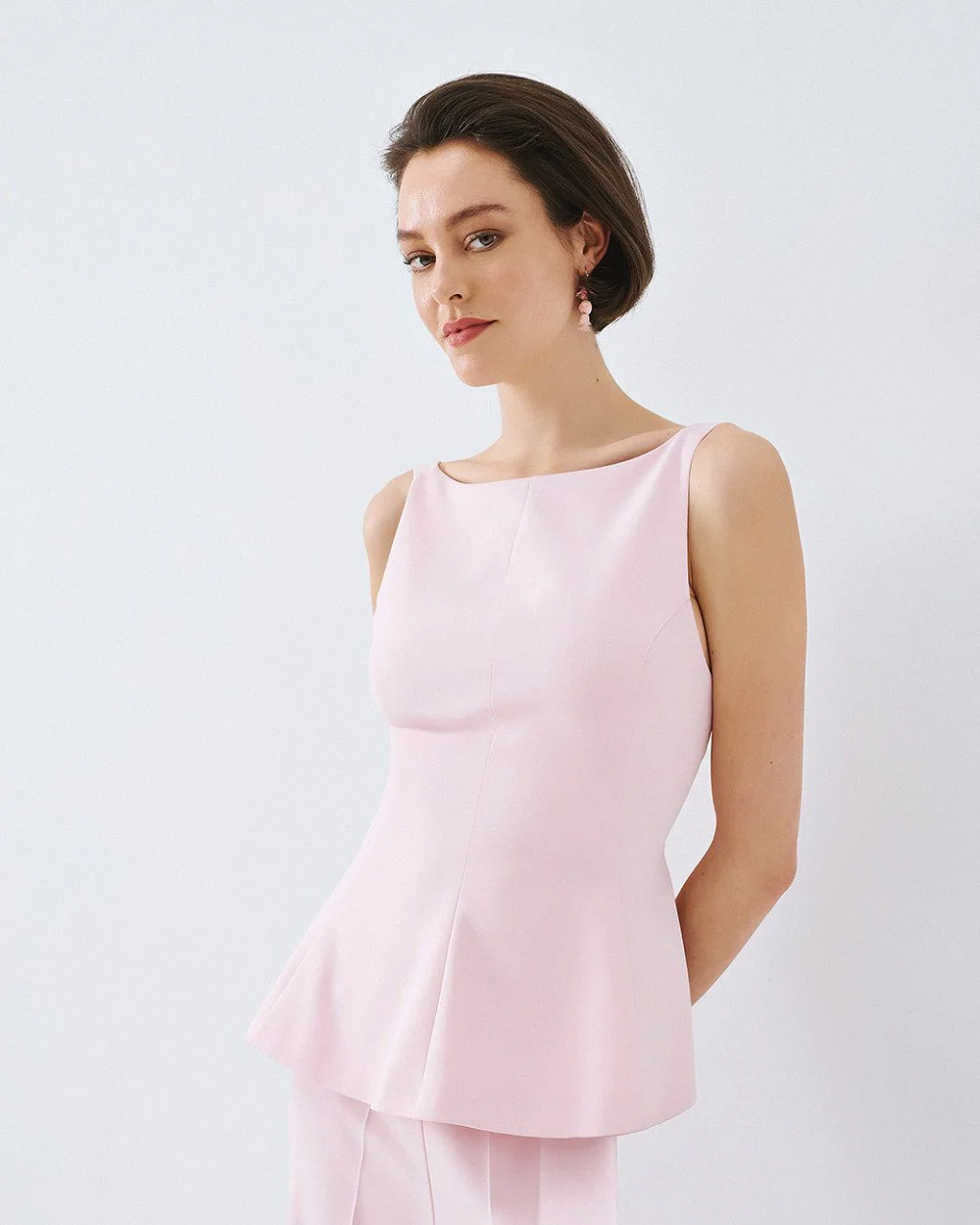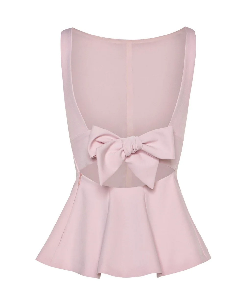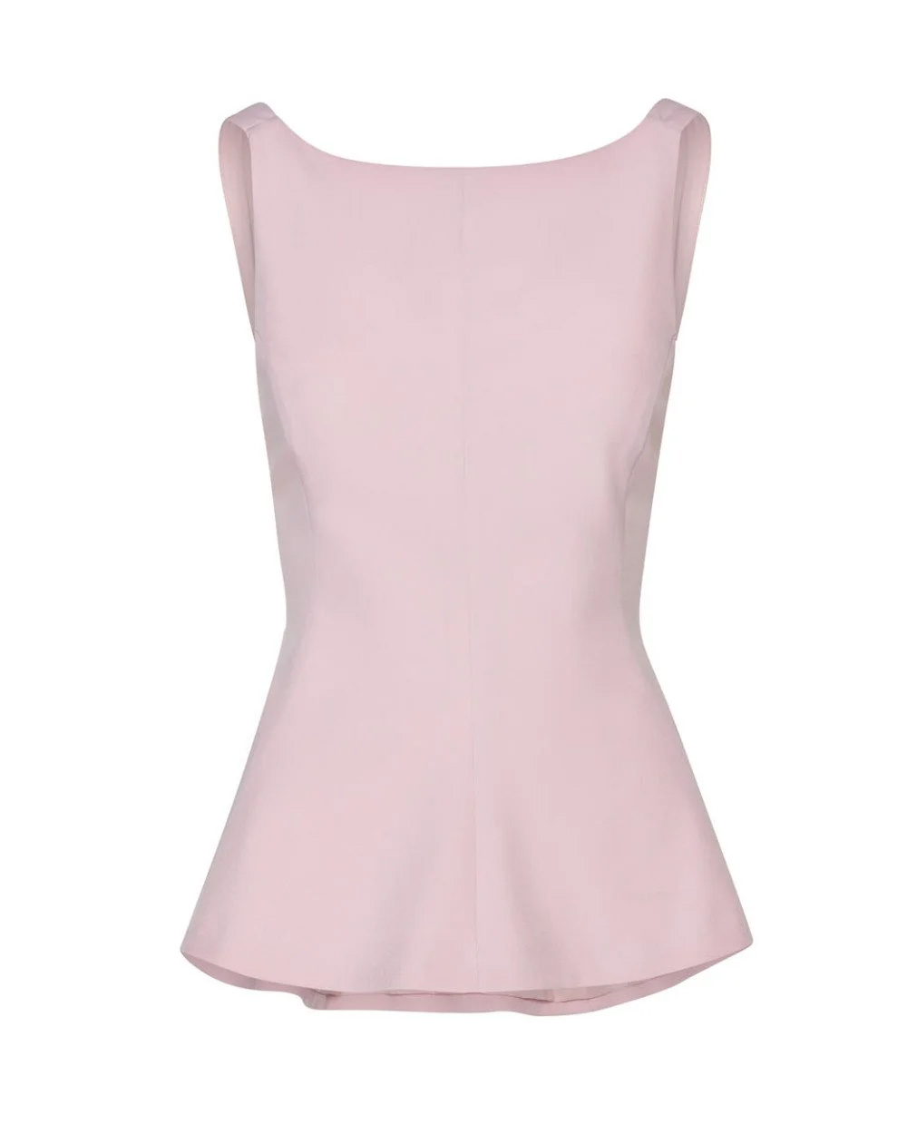 Sleeveless peplum top with straps and a boat neckline. Features an open back with a back tie closure and a side zip fastening.