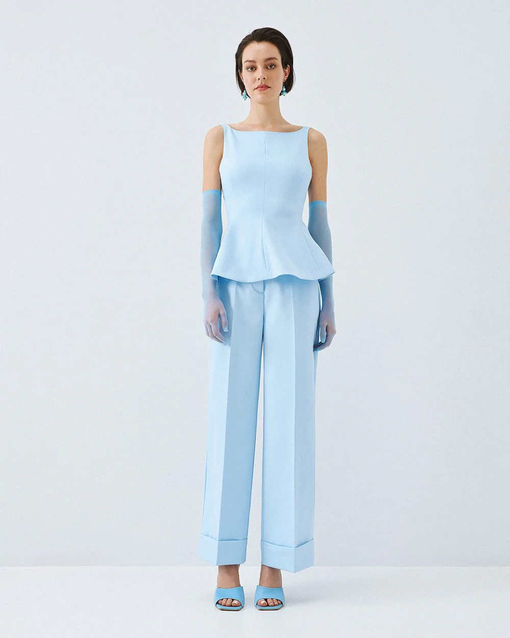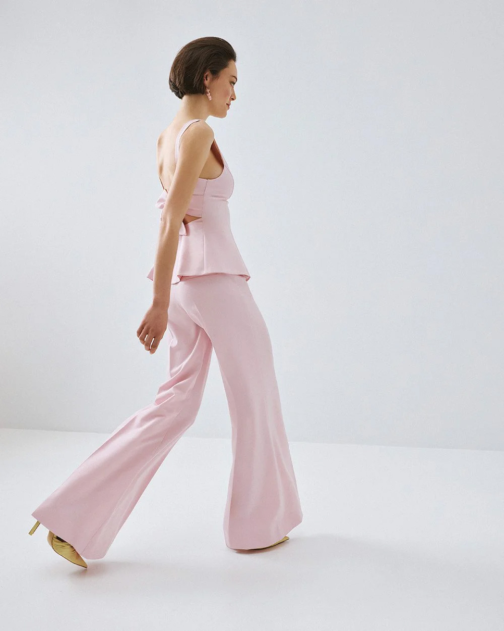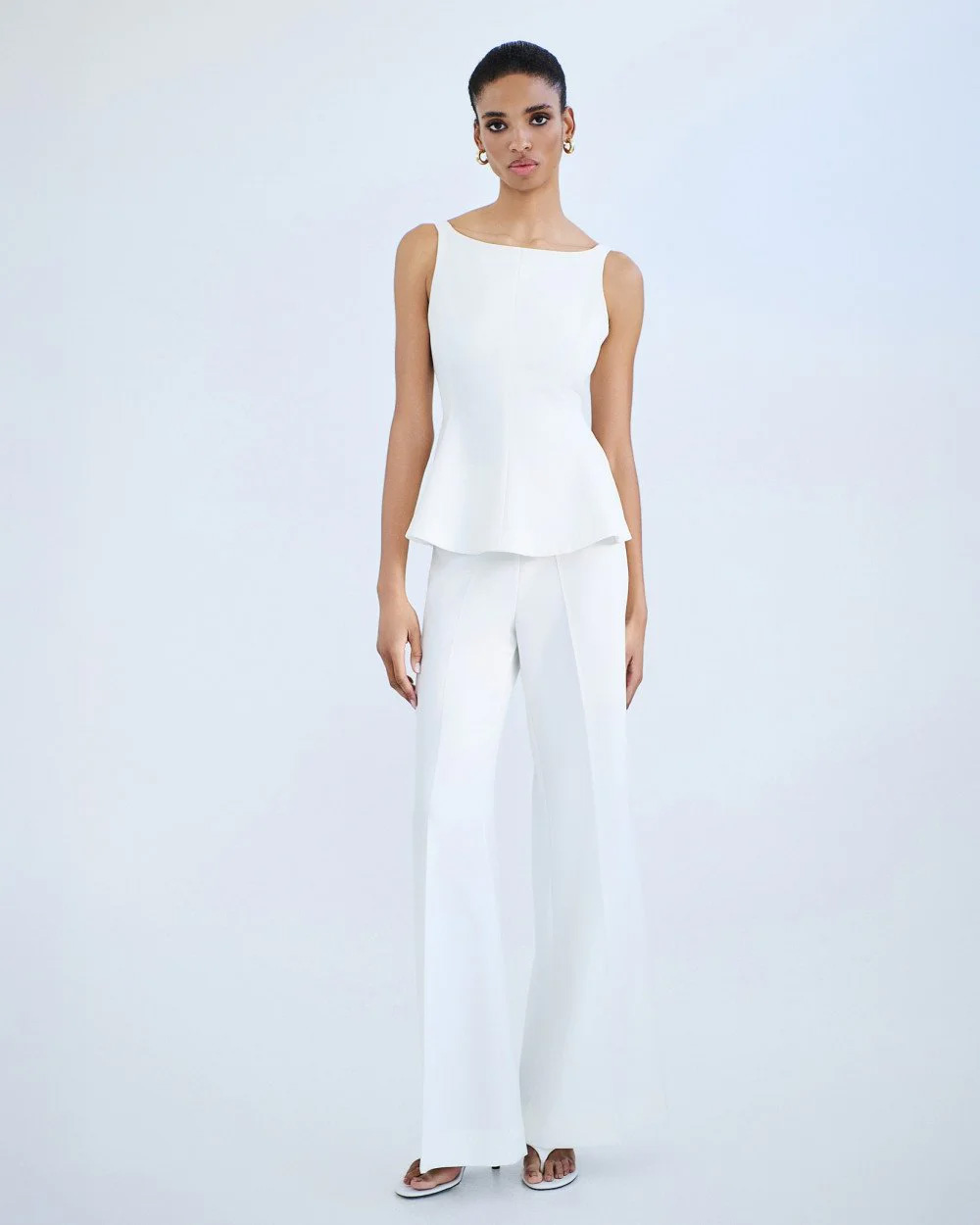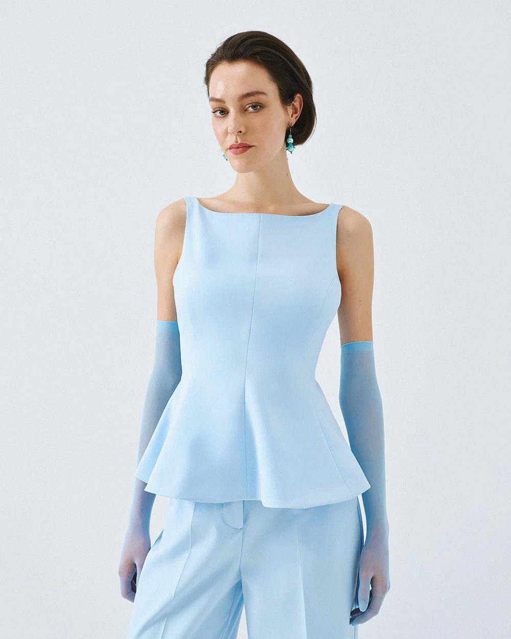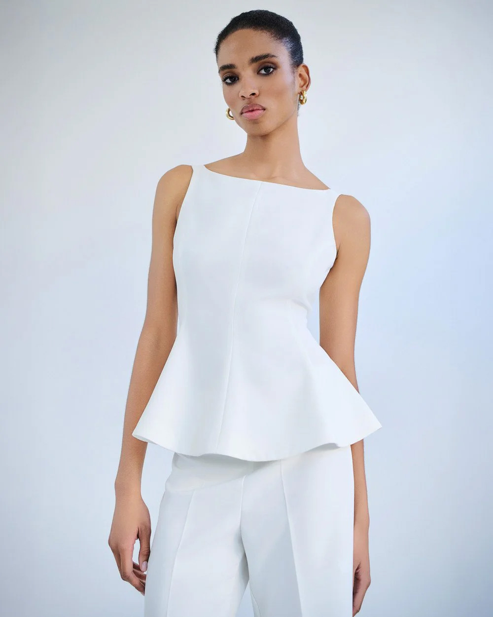 Sleeveless peplum top with straps and a boat neckline. Features an open back with a back tie closure and a side zip fastening.