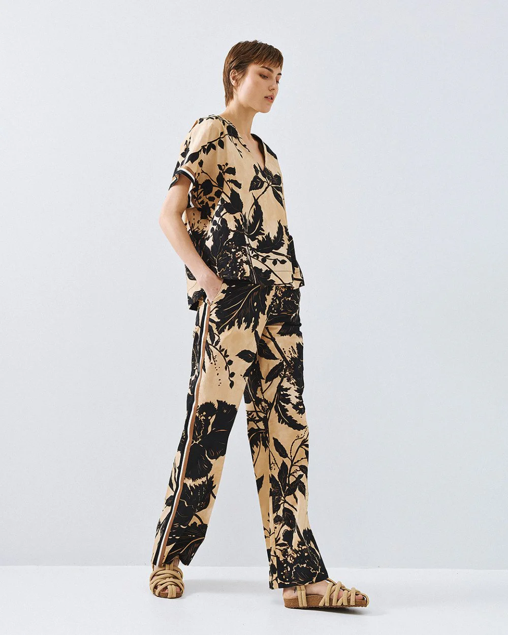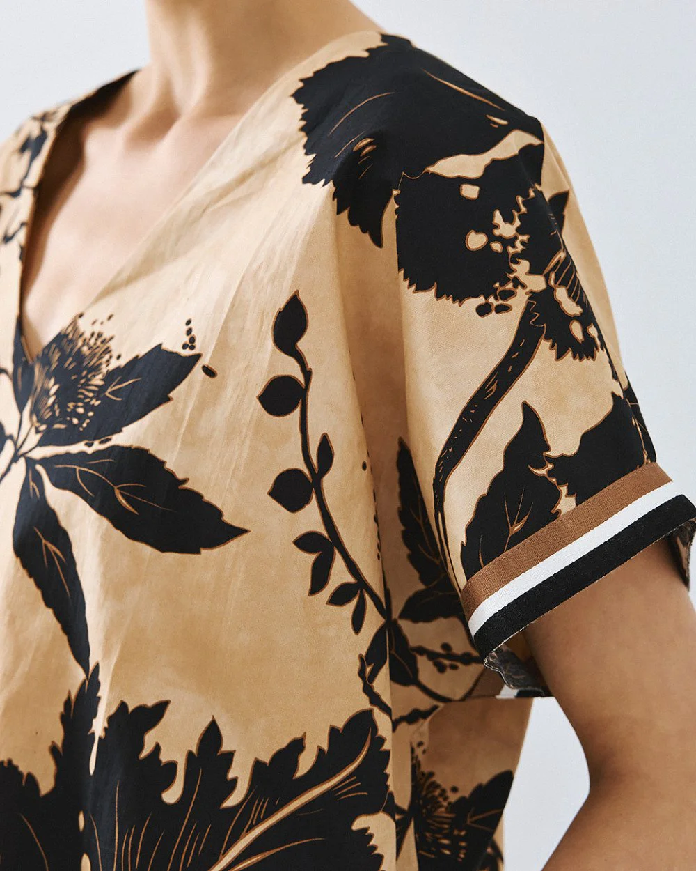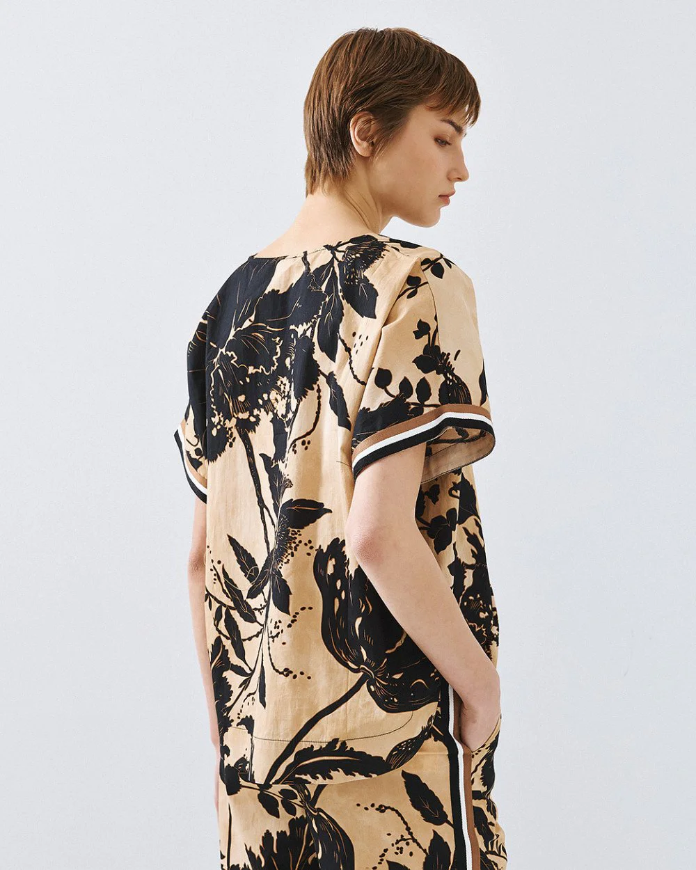 Cotton printed blouse with a v-neckline. Features short sleeves with striped trim at the hem and a detachable wide tie belt.