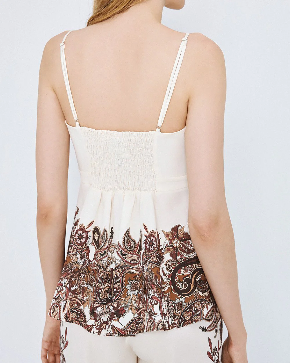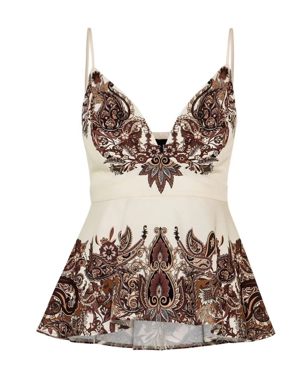 Printed peplum top with sweetheart neckline. Features thin adjustable straps and a shirred back.