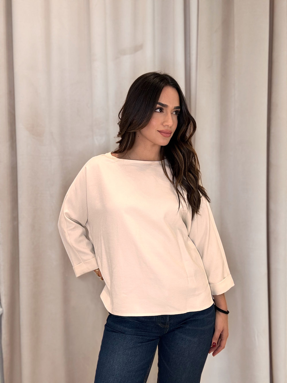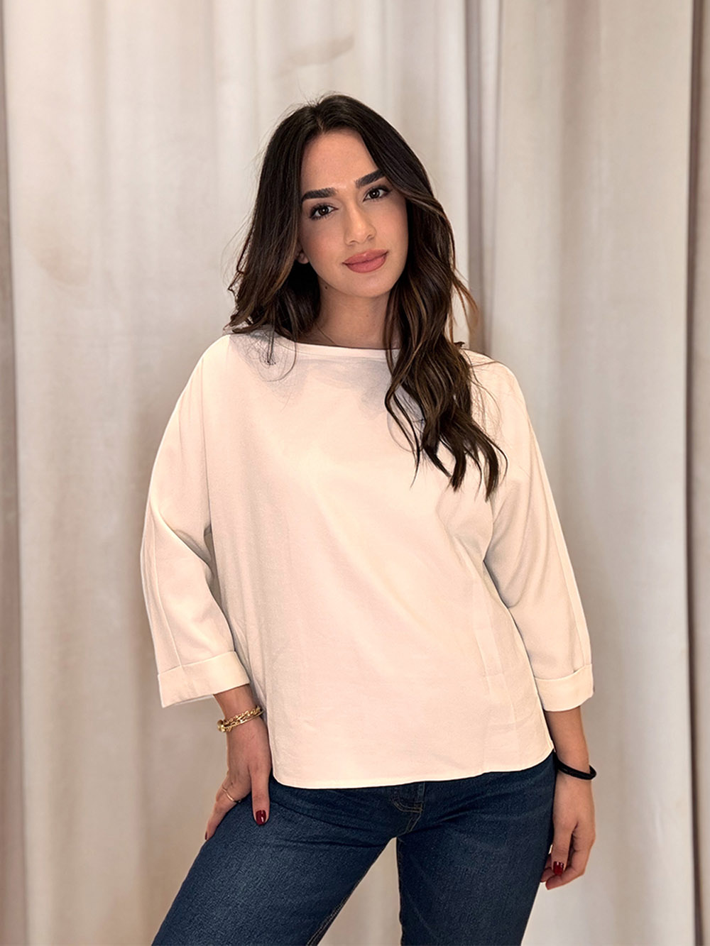 This blouse crafted from a soft cupro lightweight fabric, it features a relaxed silhouette that drapes naturally. The boat neckline adds a subtle touch and the 3/4 sleeves with cuffed hems provide a modern finish.