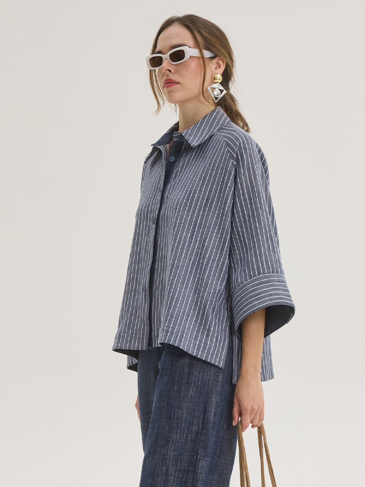 Soft cotton shirt from Innocent, crafted from a denim-like fabric with striped pattern and 3/4 bell sleeves.