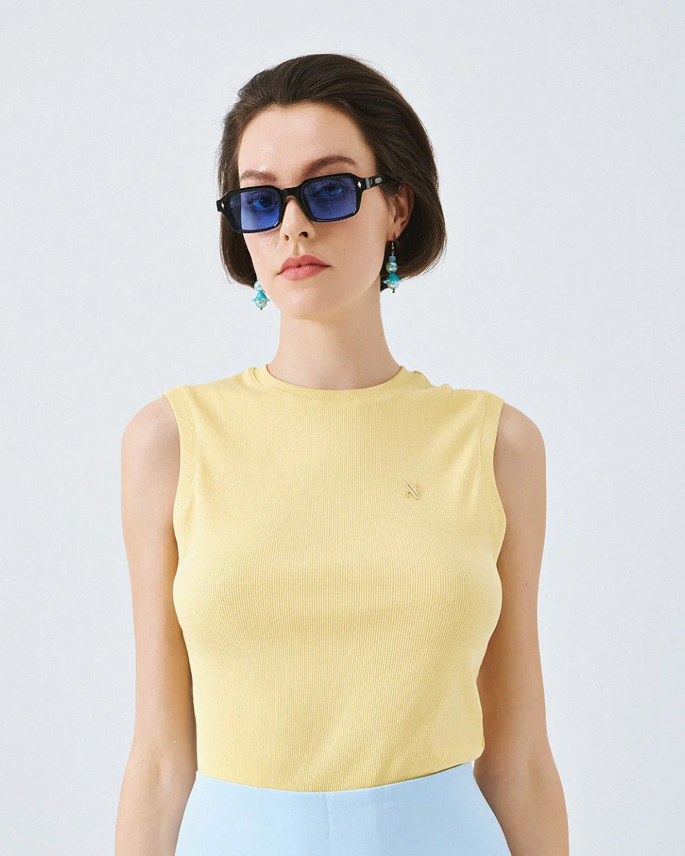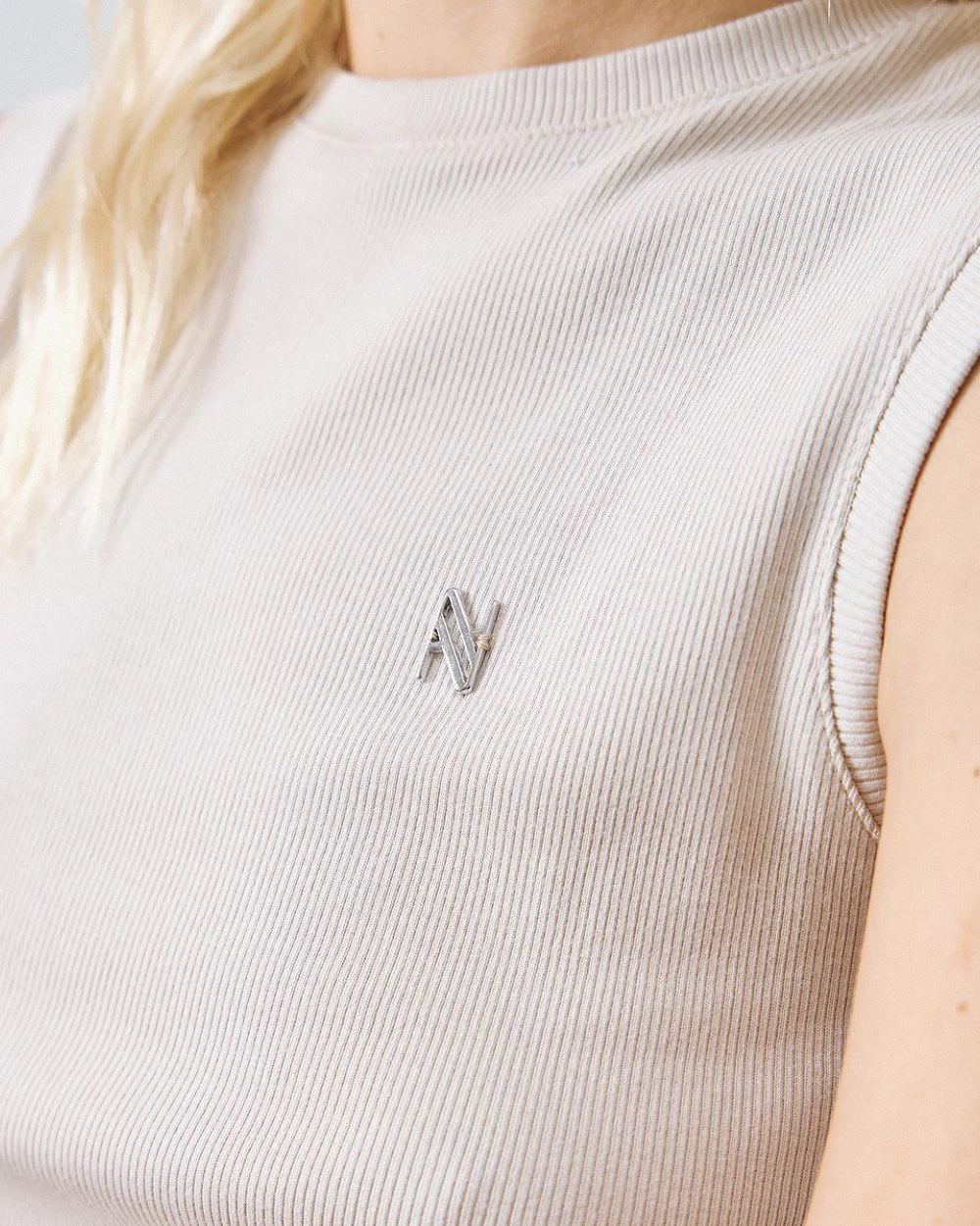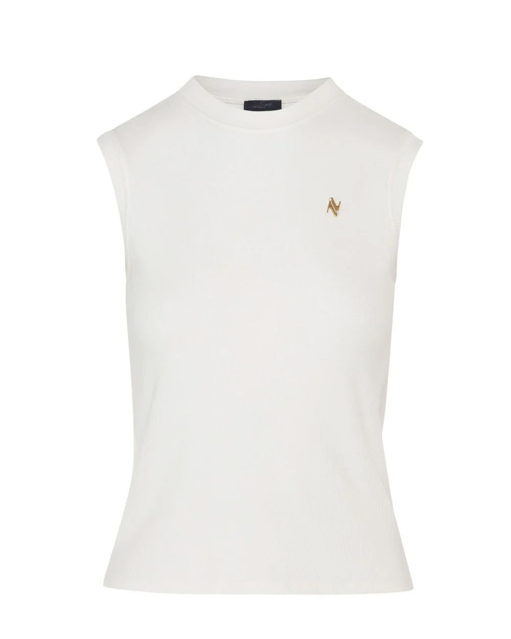 Ribbed sleeveless top with a round neckline and a decorative metallic monogram at the front.