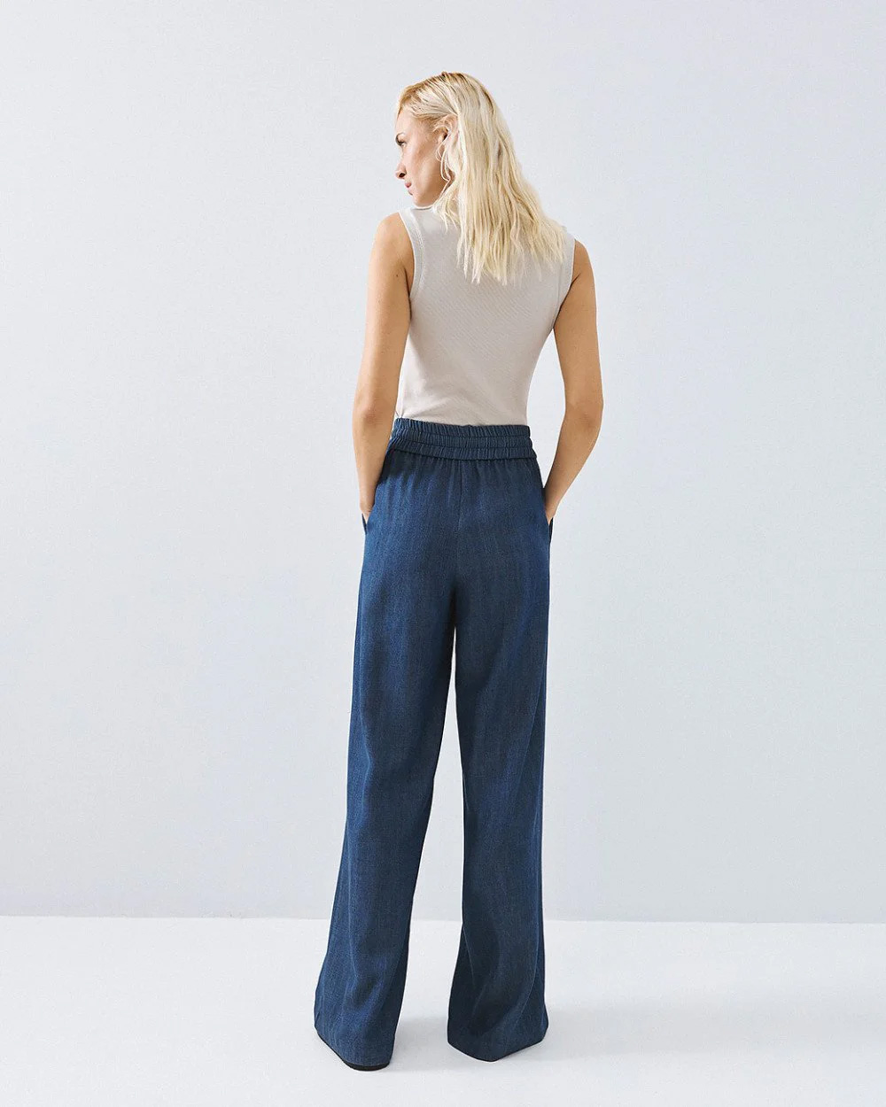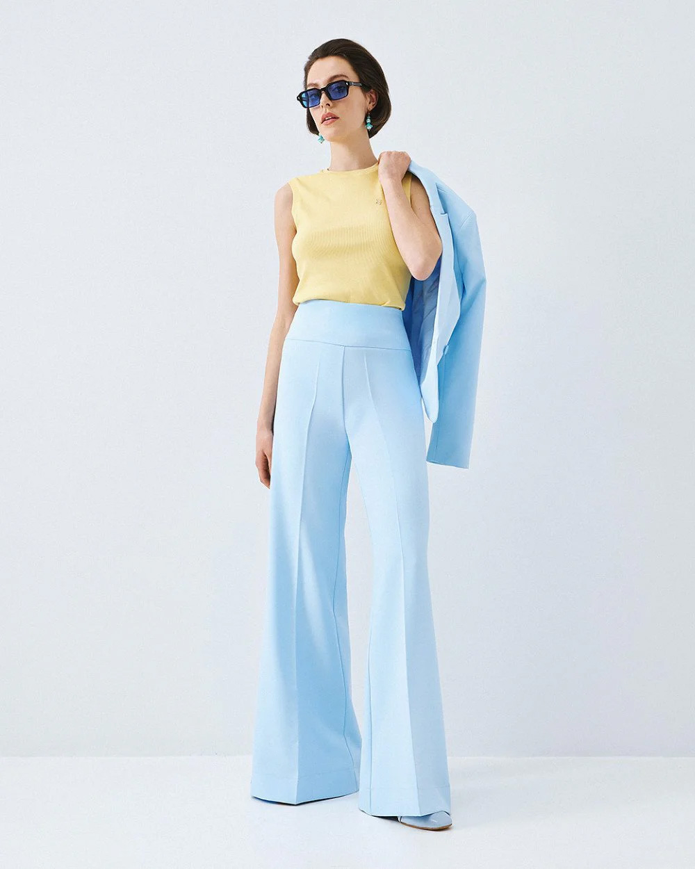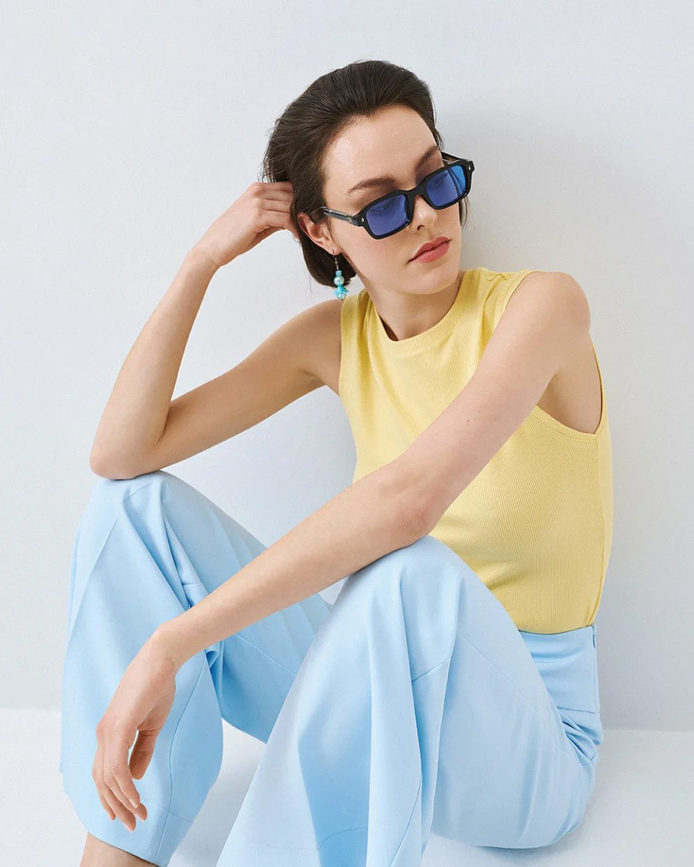Ribbed sleeveless top with a round neckline and a decorative metallic monogram at the front.