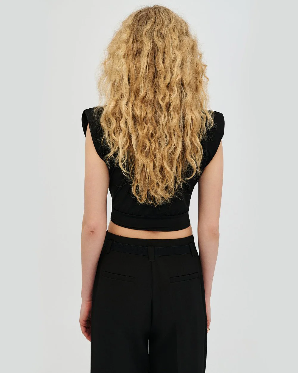 Cropped sleeveless blouse with a v-neckline and padded shoulders. Features striking front ruched details and a metallic buckle.
