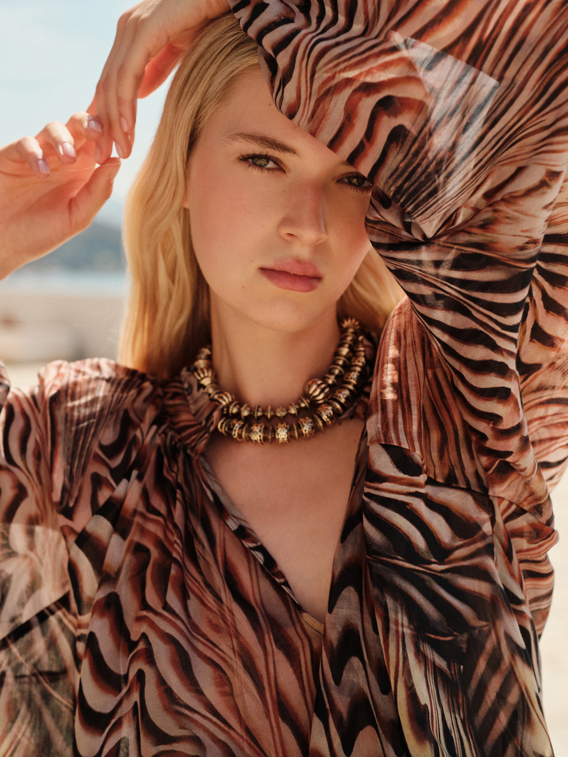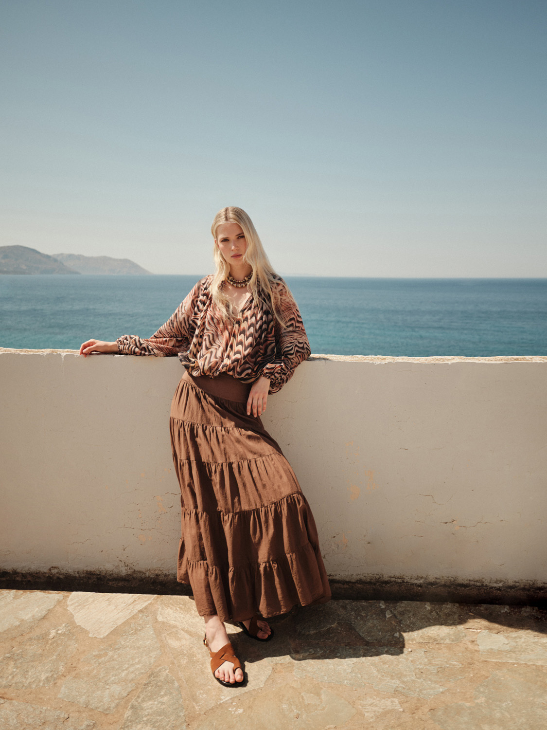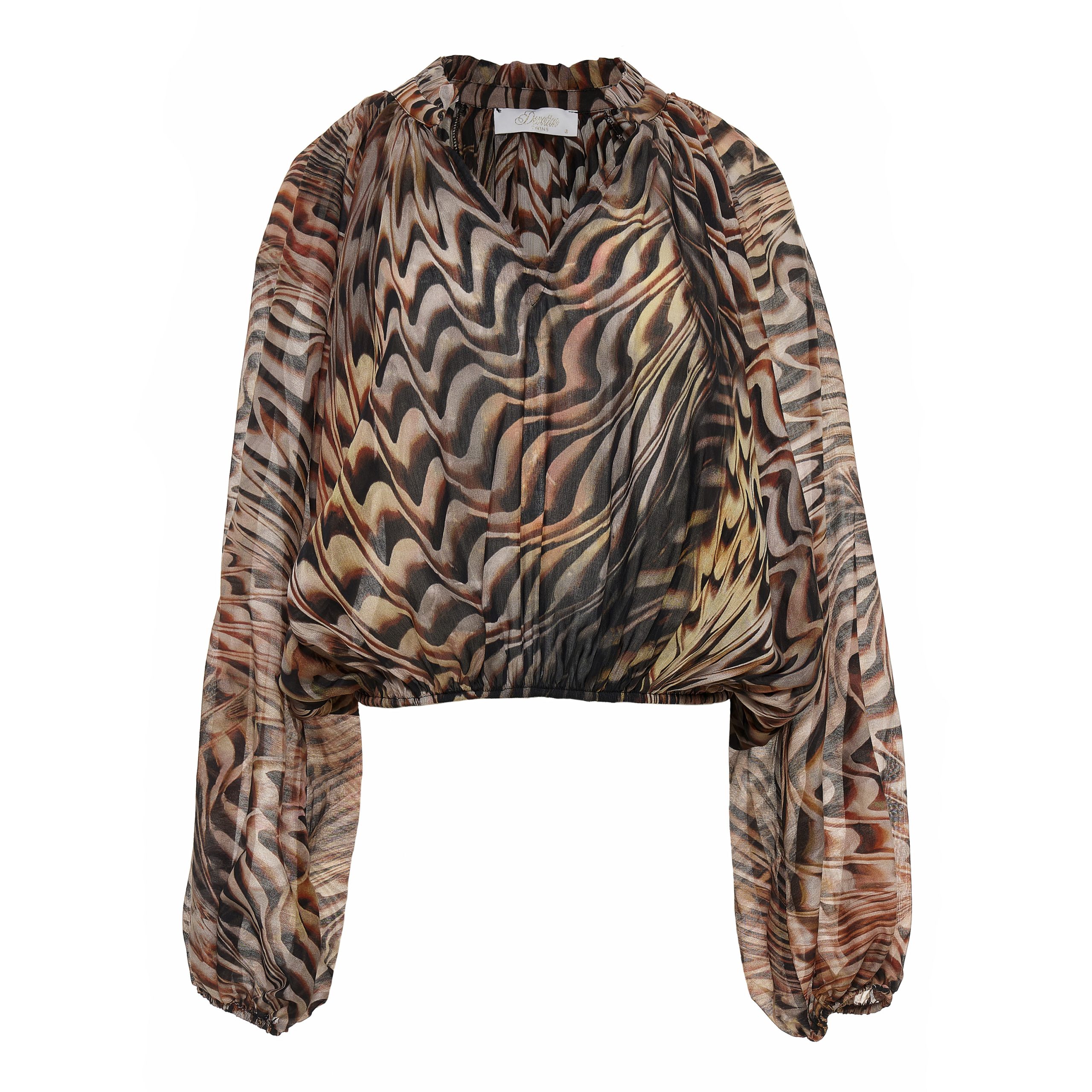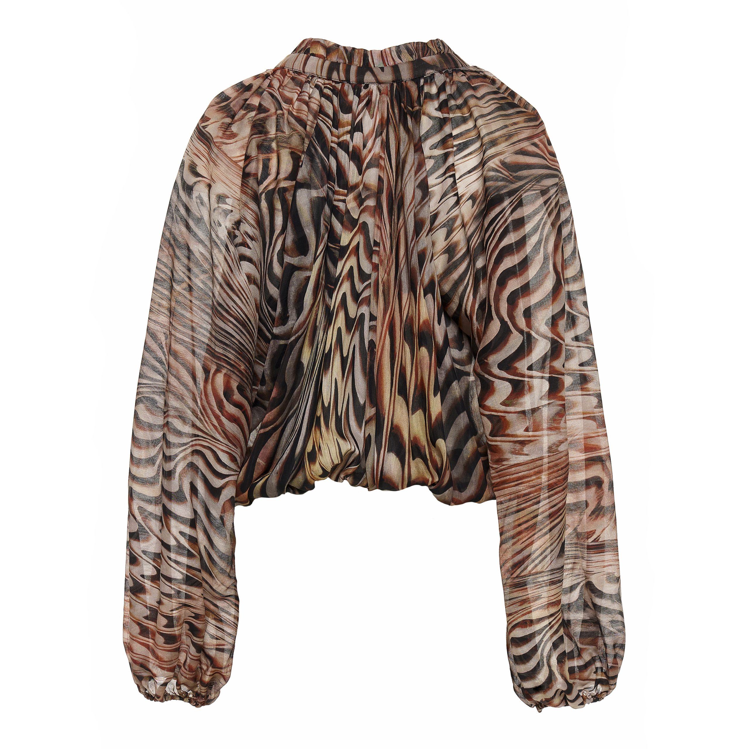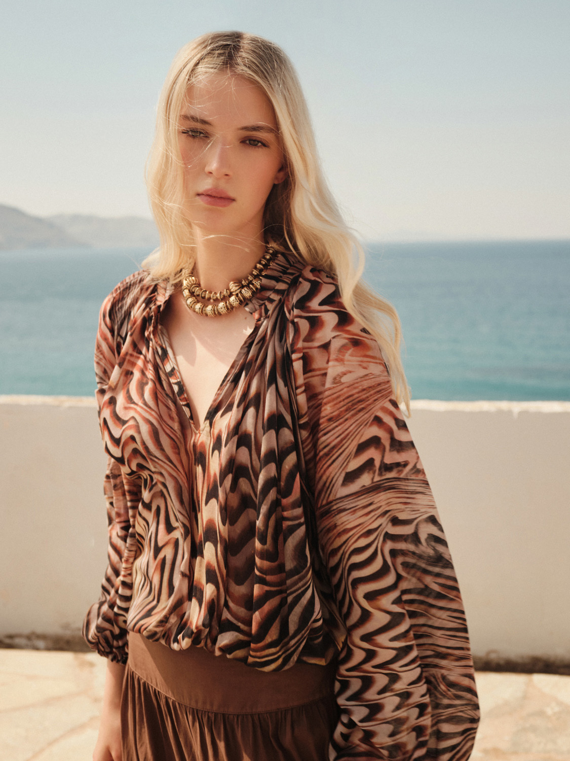 This blouse featuring an abstract wave print in warm tones of beige, brown, and black. Designed with a softly gathered neckline and a relaxed, slightly cropped silhouette. The long sleeves and the elasticated hem creates a gently shape at the waist.