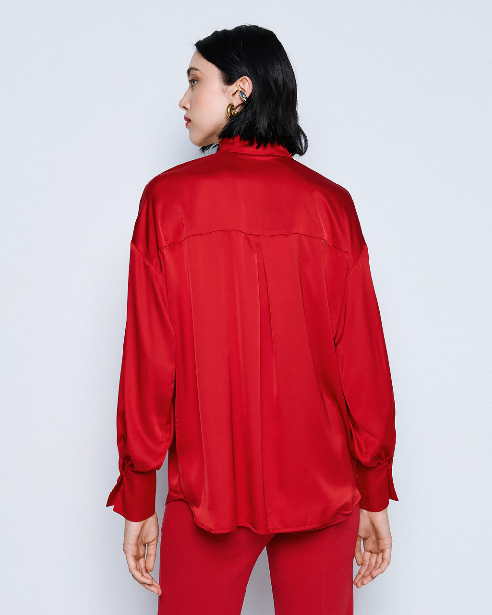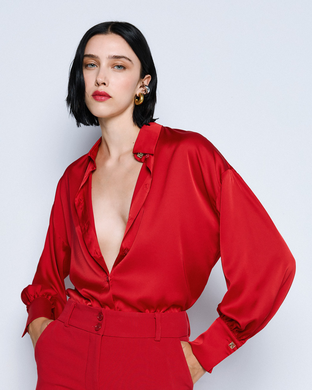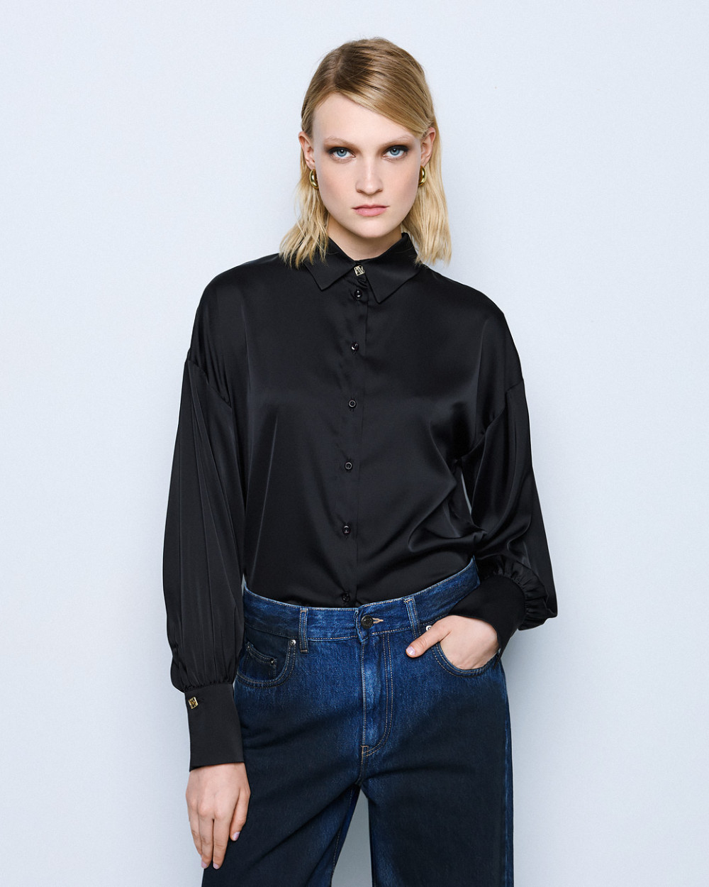 Add a refined touch to your look with this satin shirt, featuring long puff sleeves that bring volume and elegance. Designed with a classic collar and detailed with monogram buttons on the cuffs, it combines sophistication with modern style. The relaxed fit, back pleats, and smooth satin fabric ensure a comfortable yet polished silhouette, while the front button closure completes the timeless design.