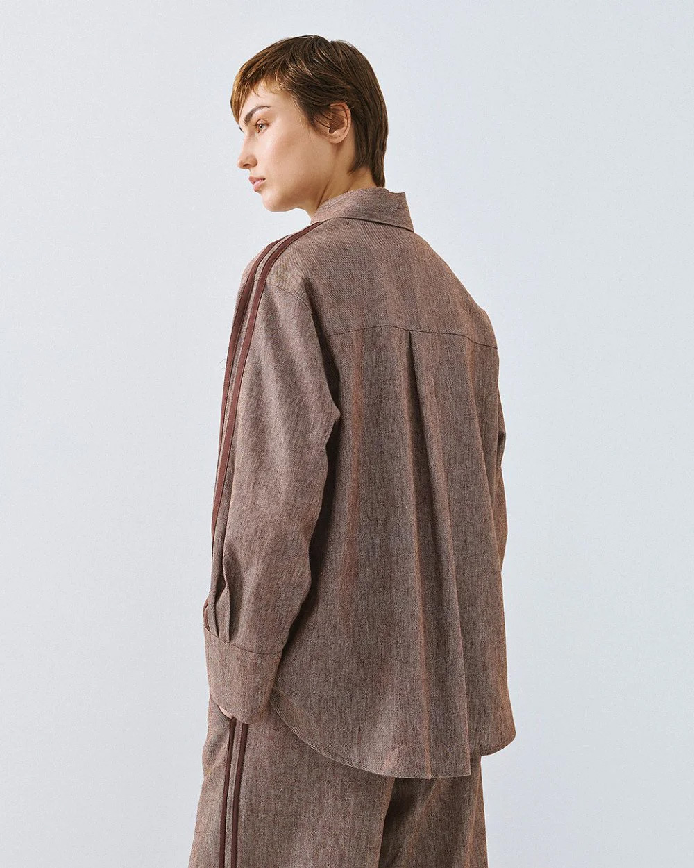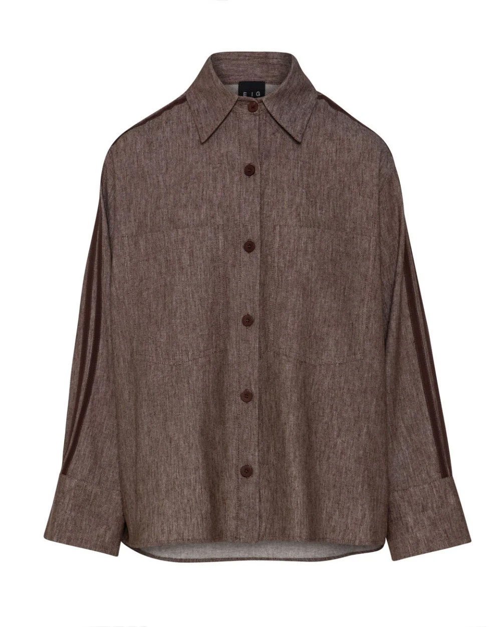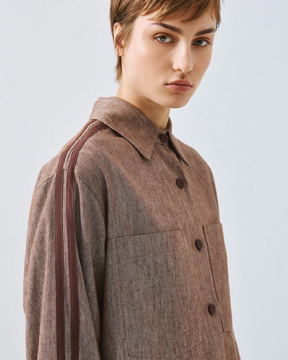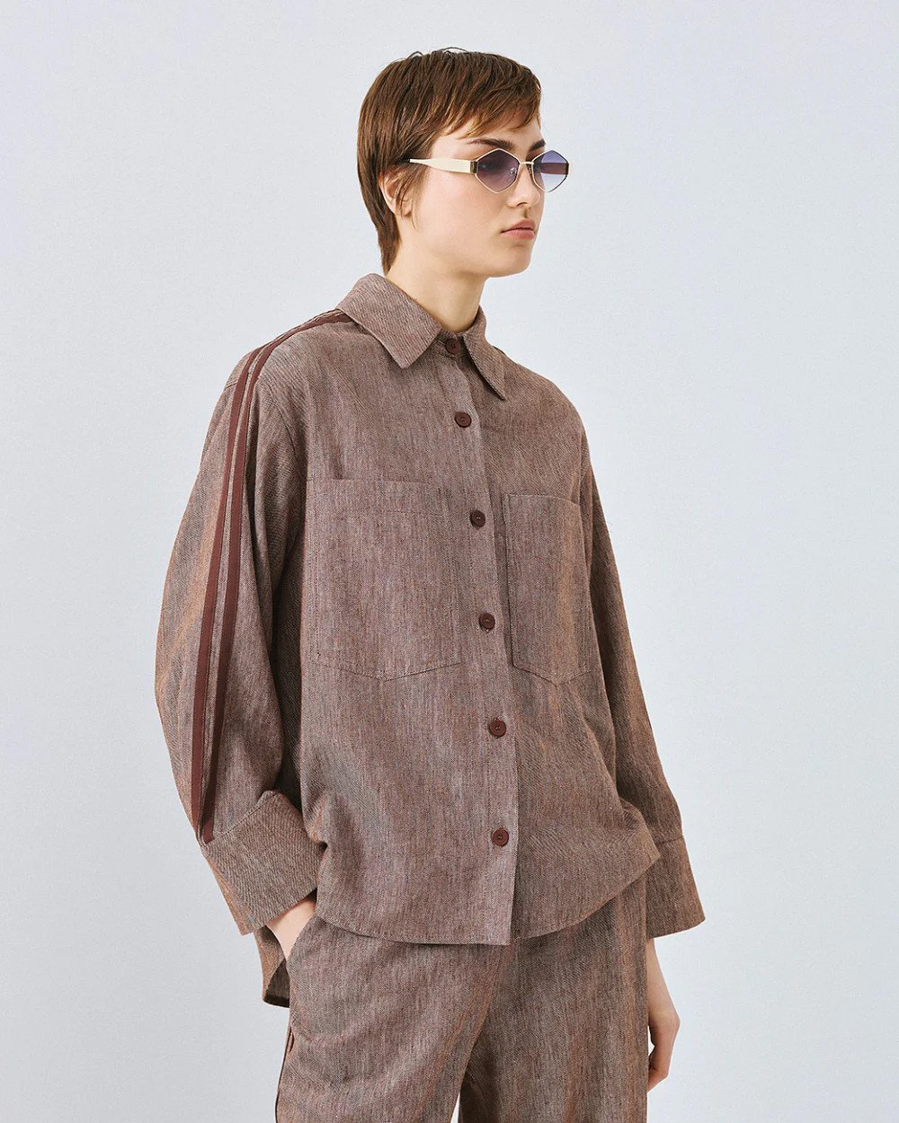 Shirt with long sleeves, a collar and striped side bands. Features a front patch pocket and a front button closure. Pair it with the matching pants from our collection.