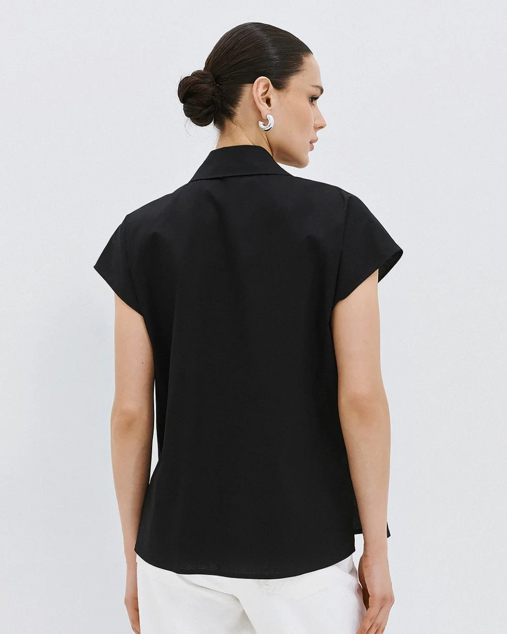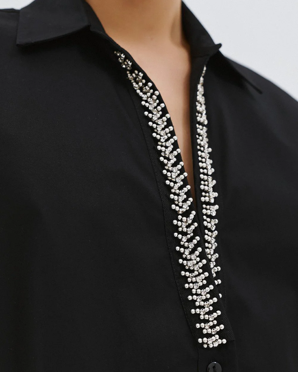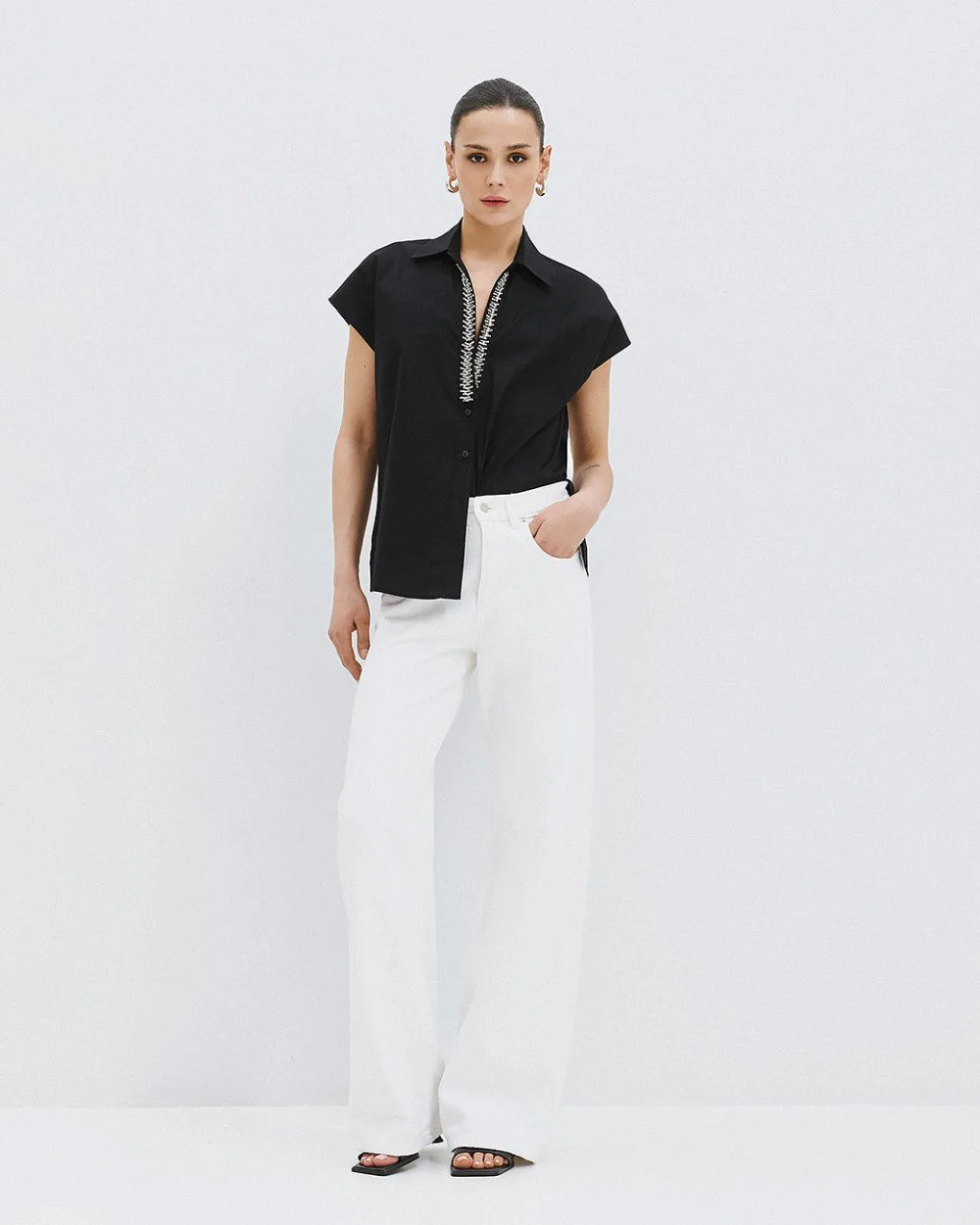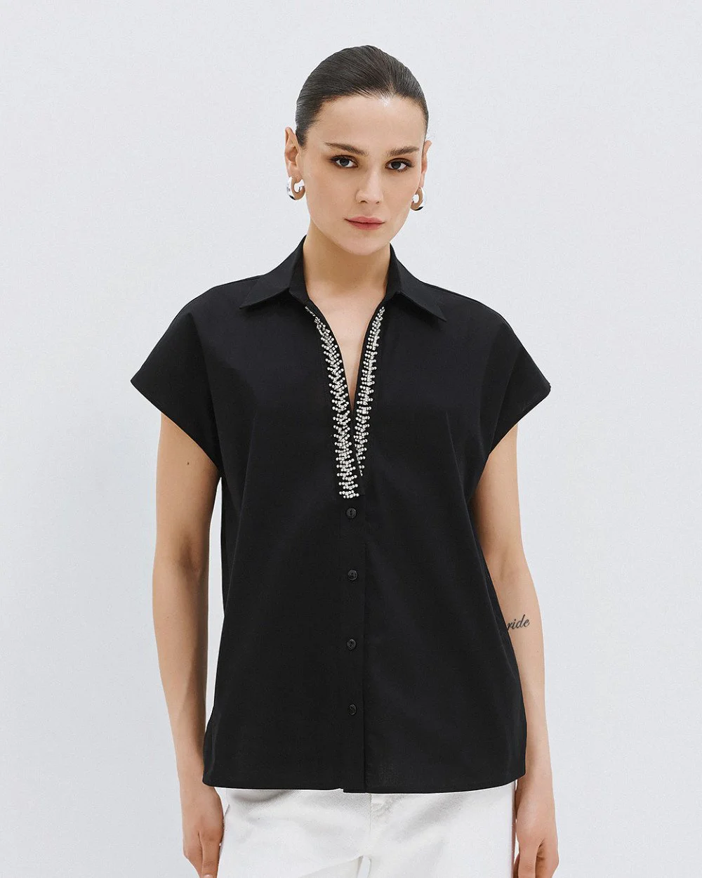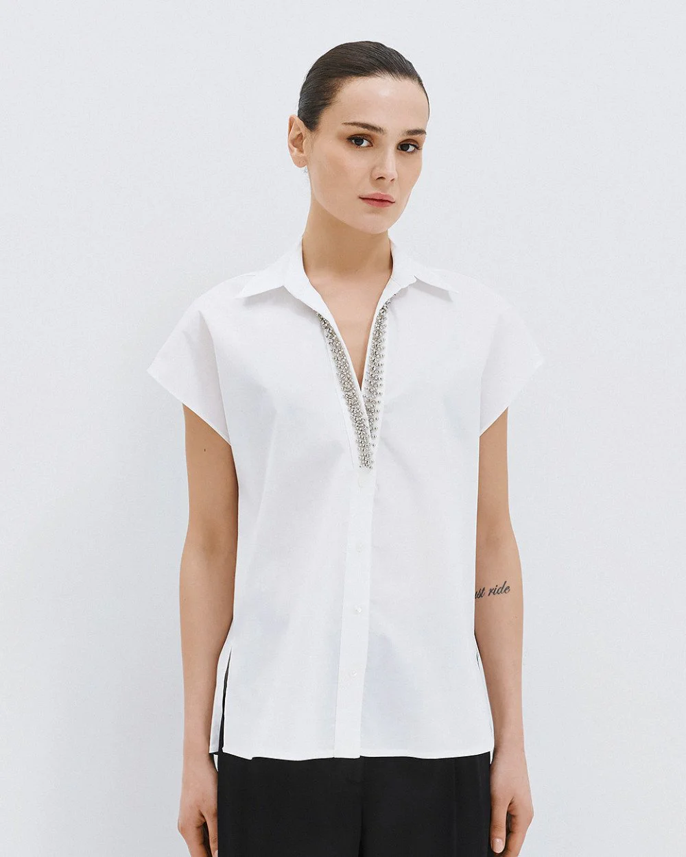 Shirt with short sleeves, a collar and a v-neckline. Features embroidered beads and rhinestones at the neckline and a front button fastening.