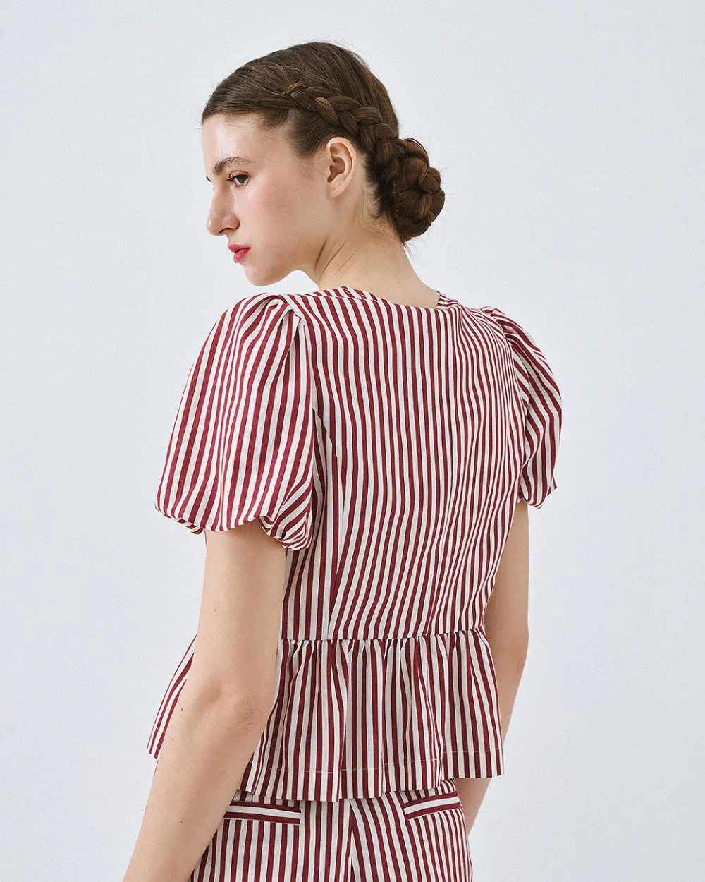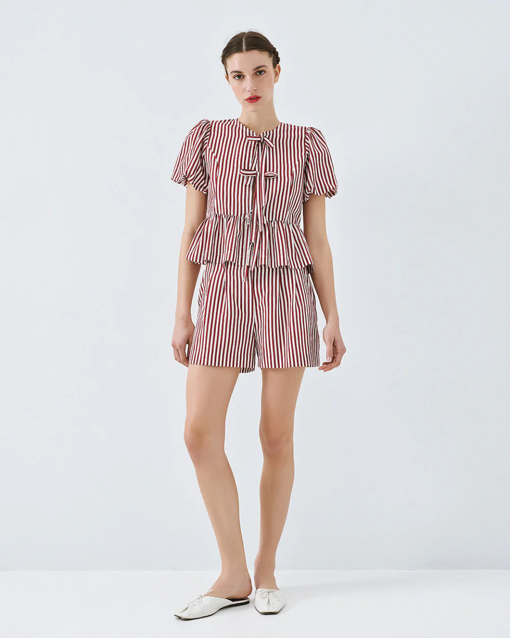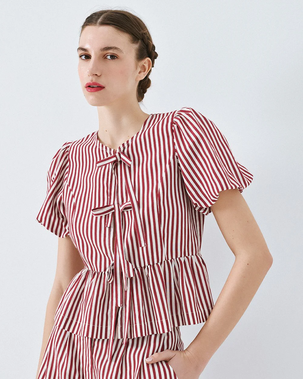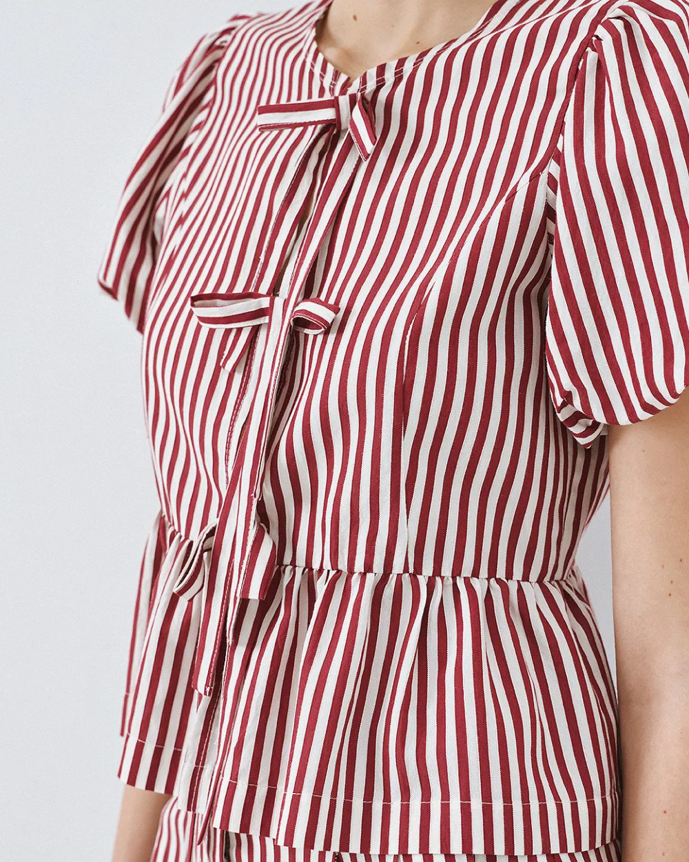 Striped blouse with short balloon sleeves, round neckline and decorative bows at the front. Features a ruffle hem and front button fastening.