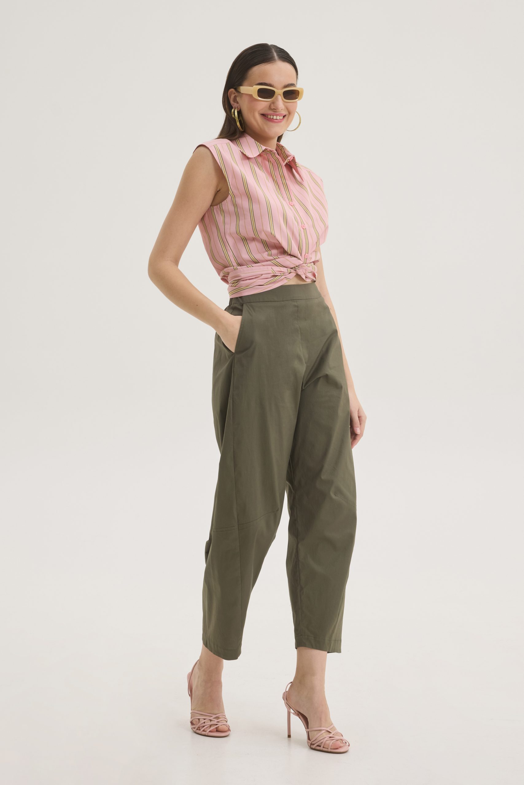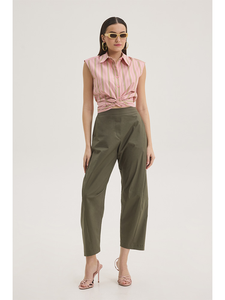 Cotton blend shirt designed in a soft pink base with fine vertical stripes. The sleeveless silhouette enhances its contemporary appeal, while the classic pointed collar and button-down front maintain timeless structure. A subtle front twist detail at the hem adds shape and dimension.