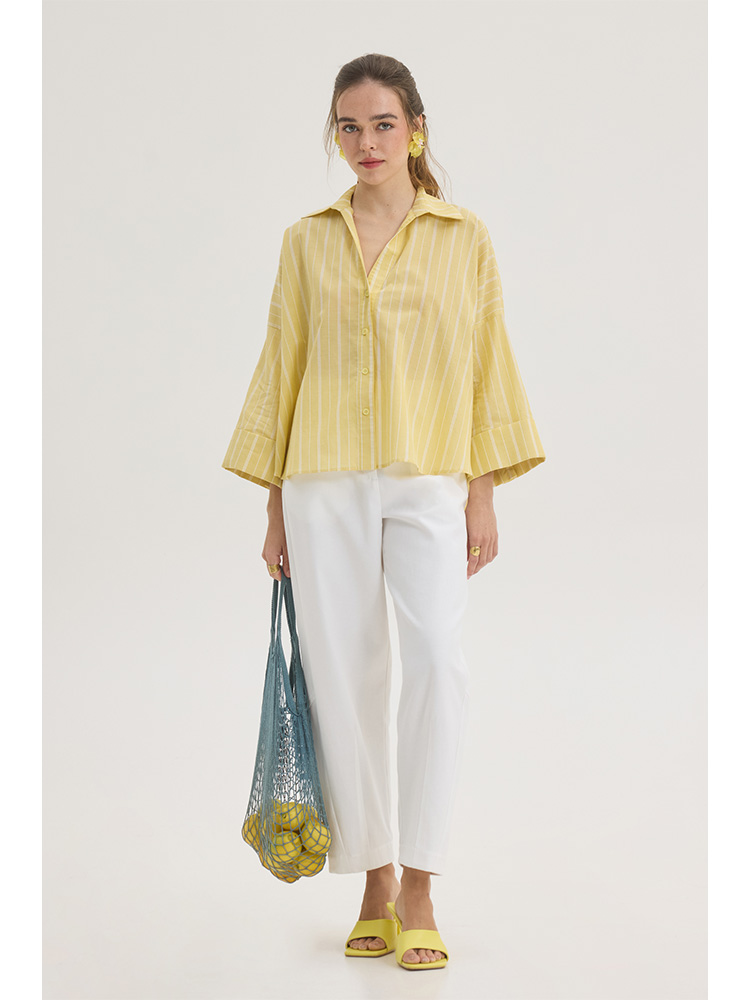 This cotton shirt crafted from lightweight, breathable cotton it features fine vertical white stripes that create a flattering effect. The relaxed silhouette is complemented by dropped shoulders and wide sleeves, offering ease of movement and airy feel. A classic pointed collar and button-down front maintain timeless structure, while the slightly cropped length adds a contemporary edge.