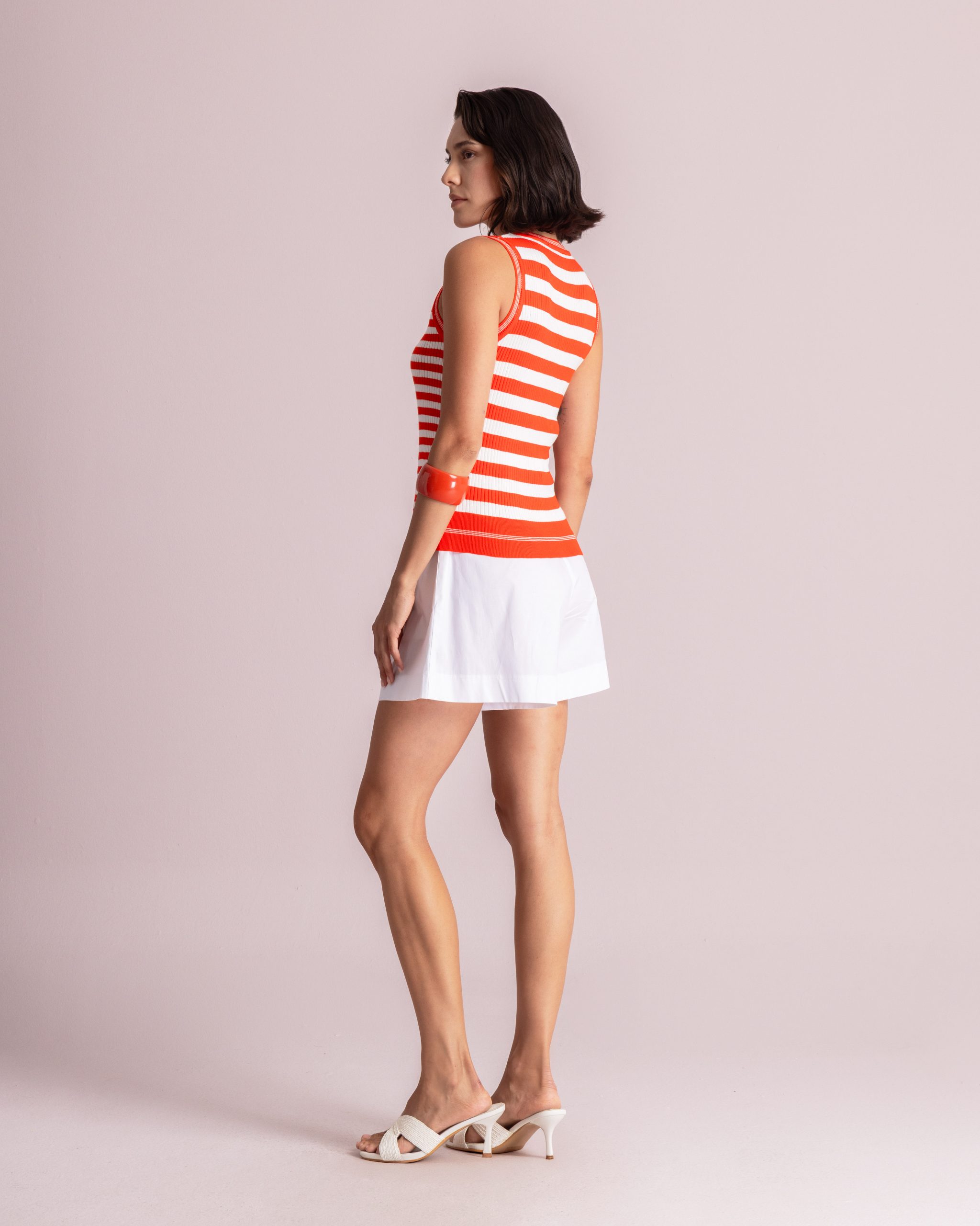 this knit blouse is crafted from a soft, stretch knit fabric. Designed with a sleeveless cut and a rounded neckline.