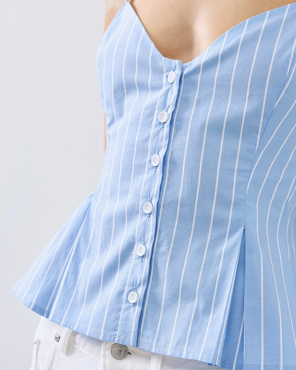 Striped cropped top with thin adjustable straps and a sweetheart neckline. Features pleat detailing and a front button fastening.