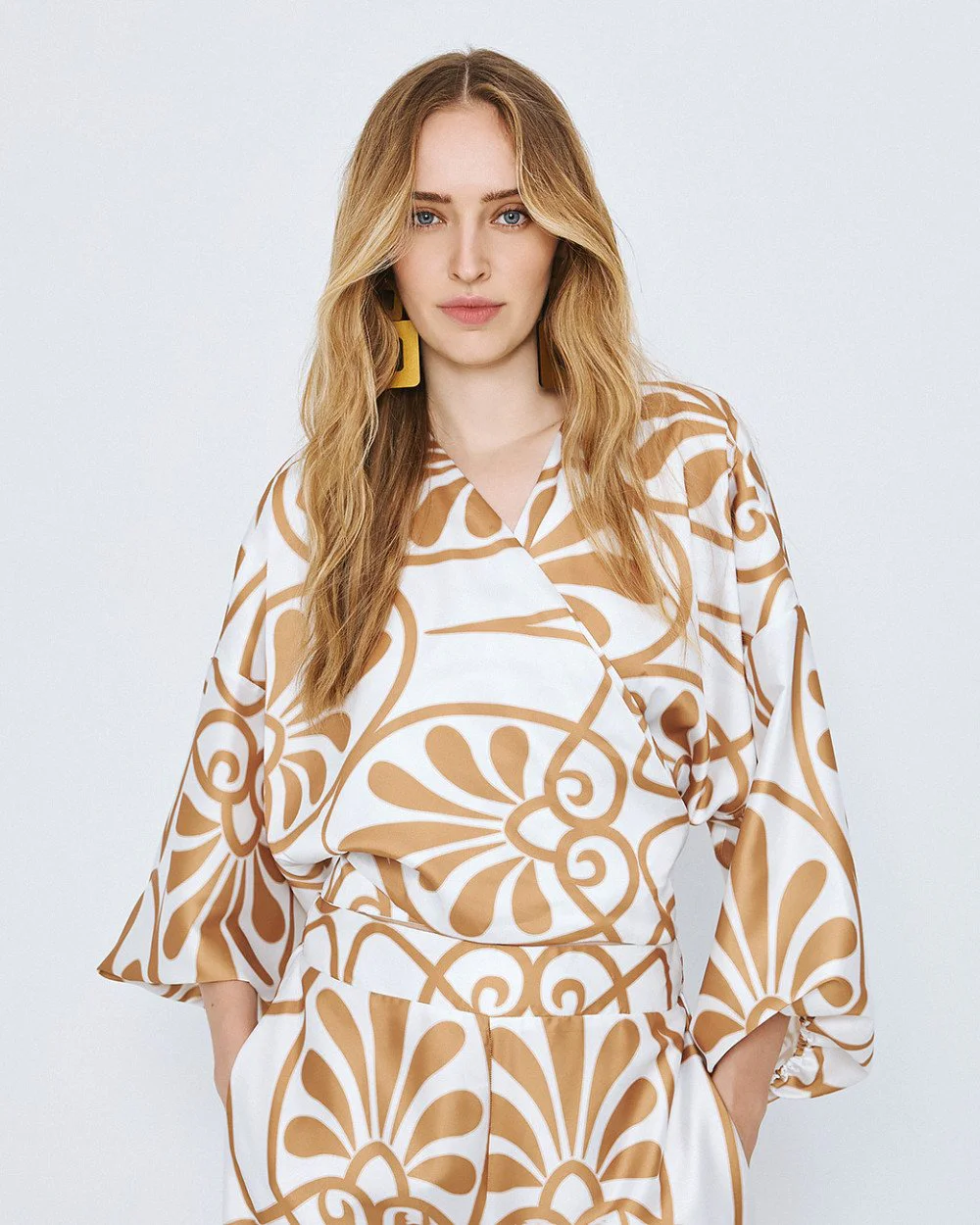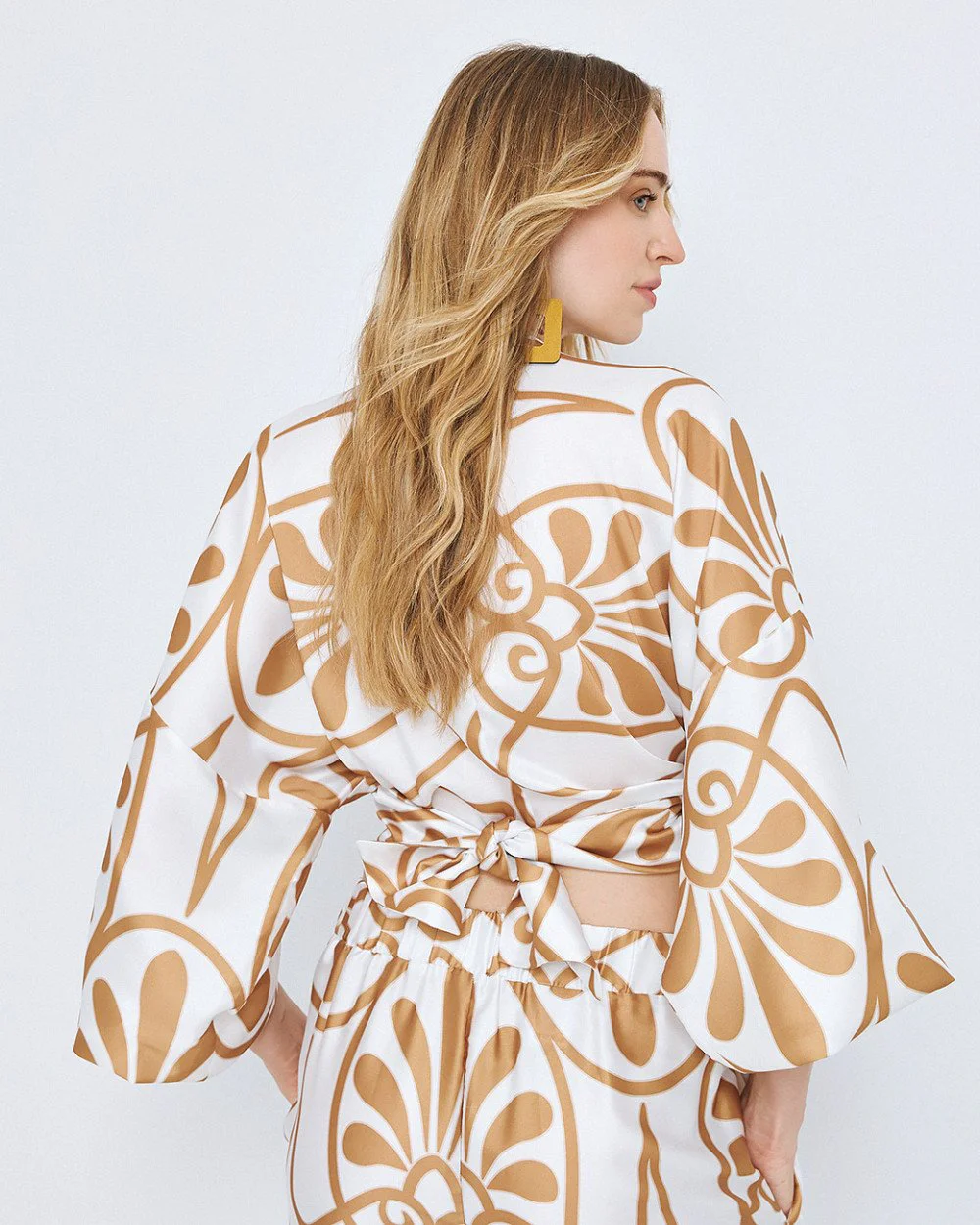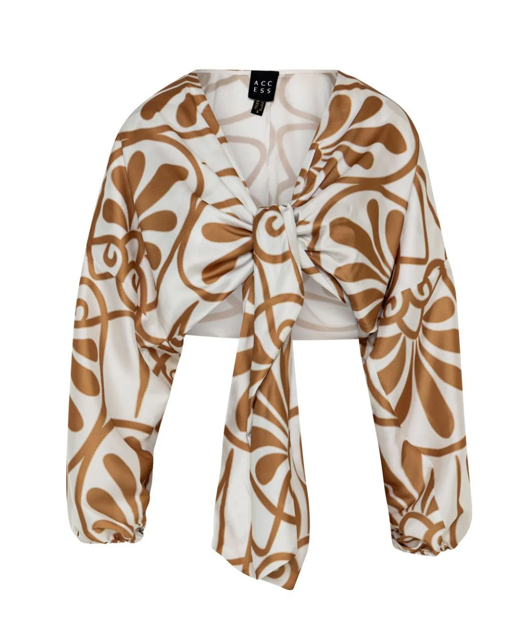 Cropped printed blouse with a front tie and long puff sleeves with elastic cuffs.