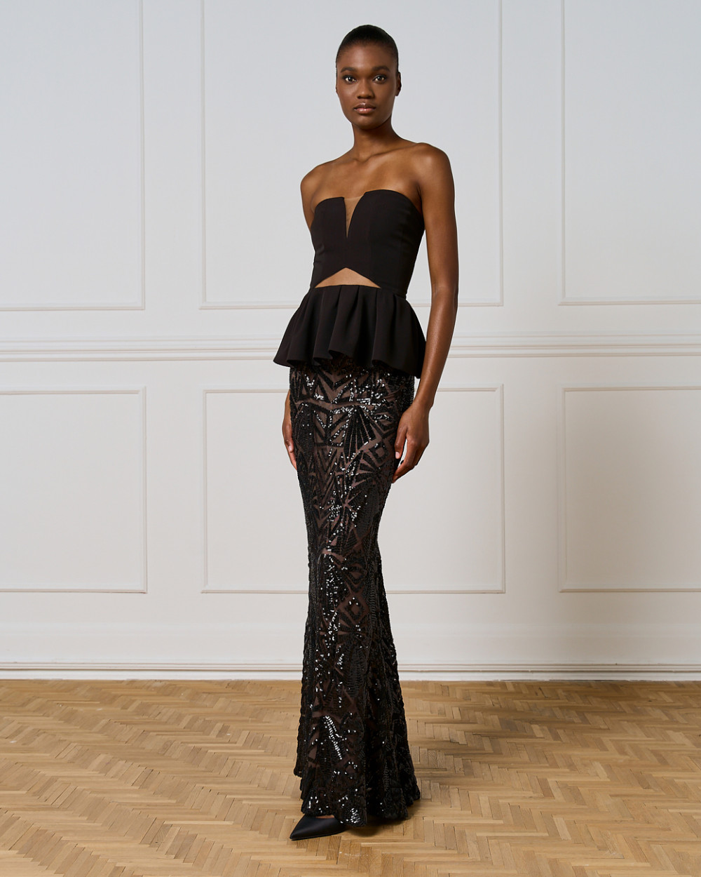 – Strapless with a deep front cut-out