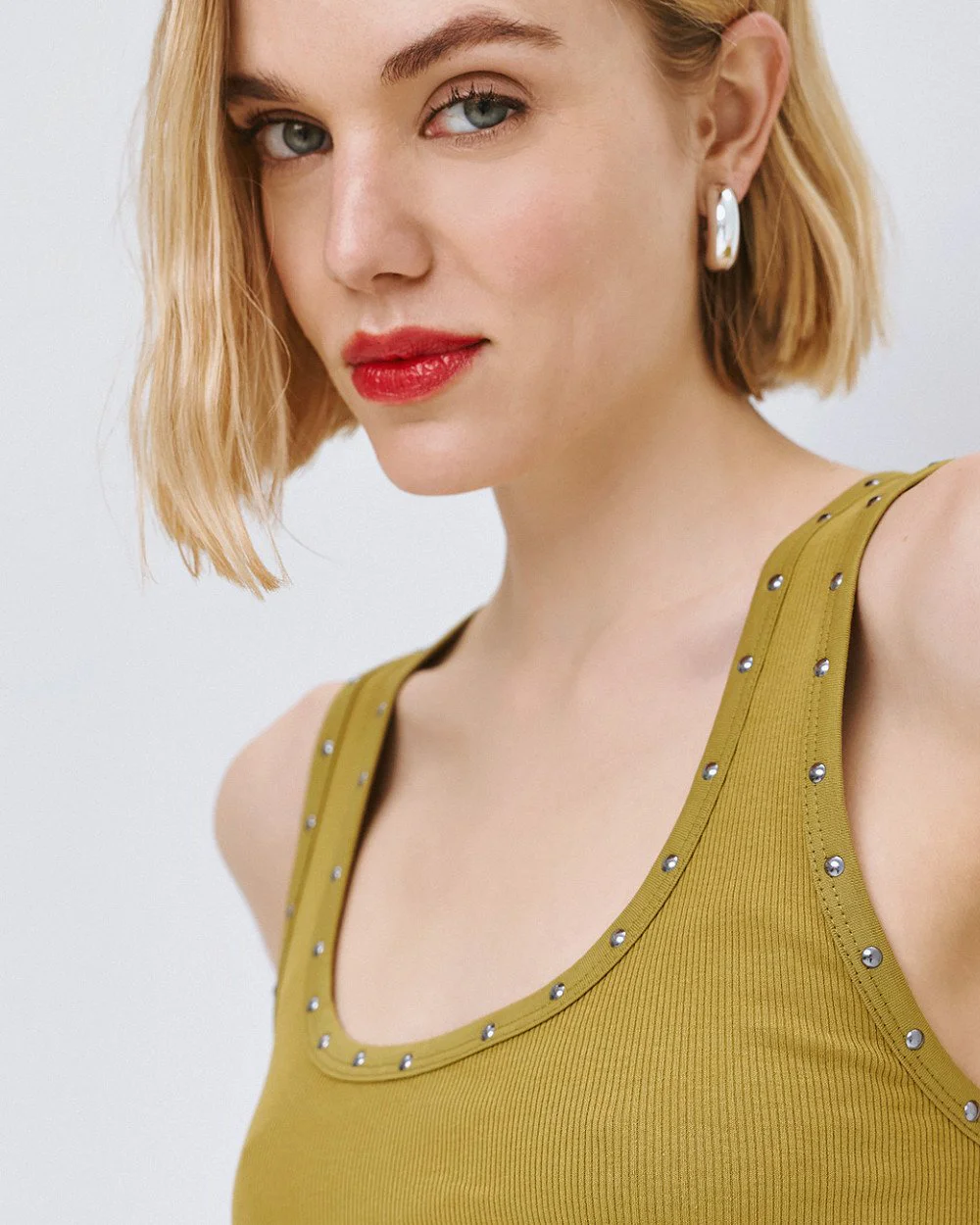 Ribbed top with straps, a scoop neckline and decorative snap buttons.
