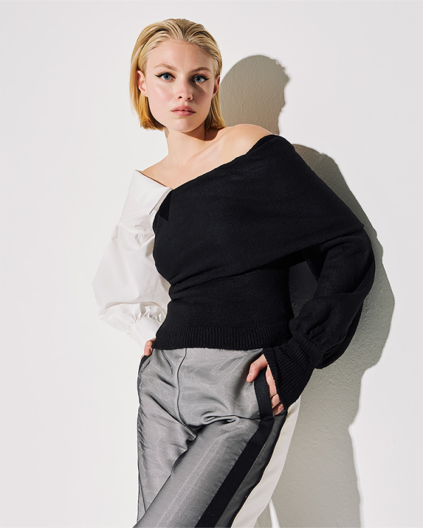 Shirt-knit sweater with a contrasting black knit body and asymmetric detailing against a crisp white shirt sleeve, it offers a bold, fashion-forward silhouette. Perfect for both office chic and evening looks.