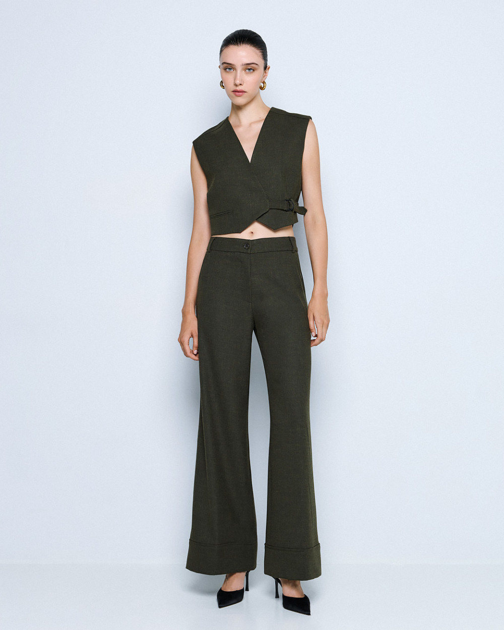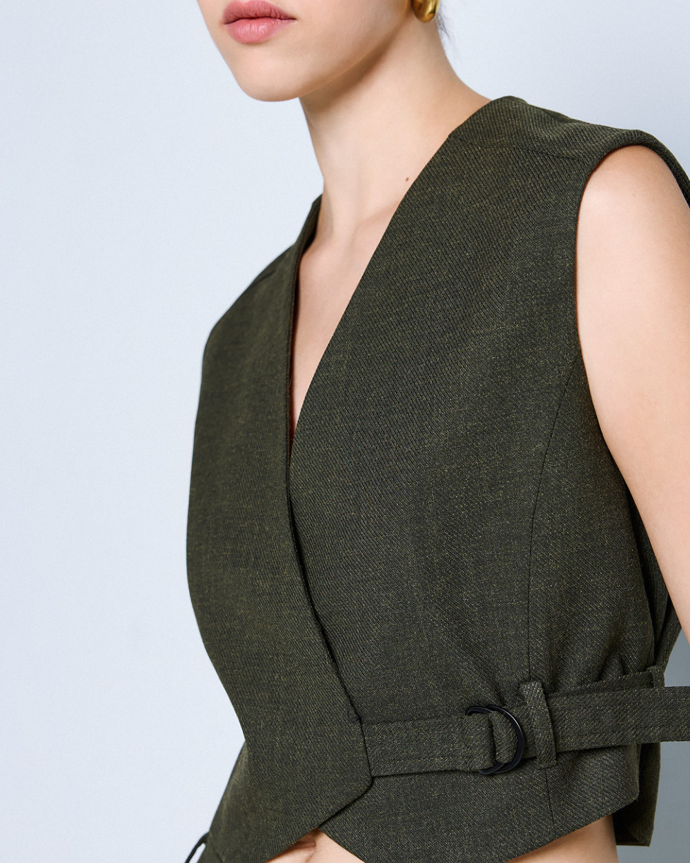 Vest-style top with a V-neckline and side belt fastening with a buckle from Access Fashion. Features a decorative front welt pocket. Pair it with the matching pants from our collection for elegant office looks.