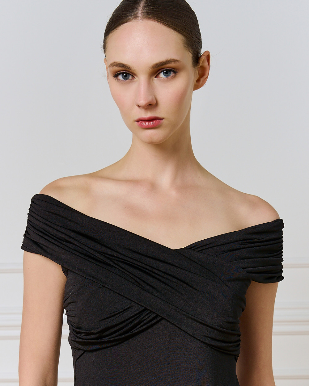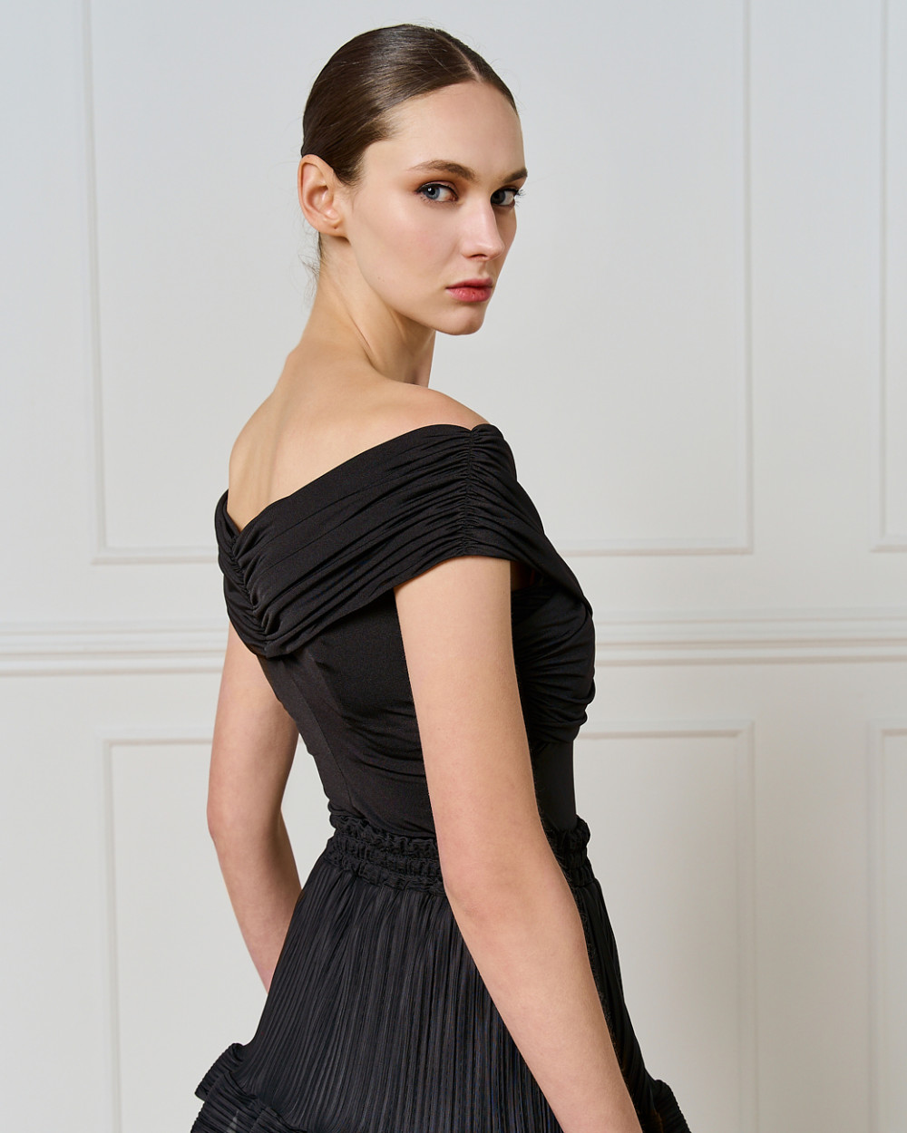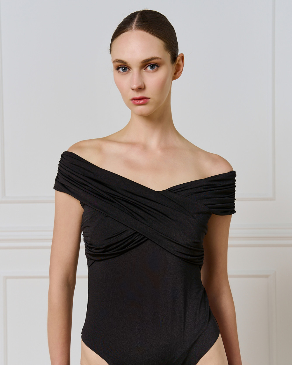 Turn up the elegance with this off-the-shoulder wrap bodysuit, featuring gathered details that enhance its sophisticated silhouette. Crafted from elastic fabric for a comfortable, figure-flattering fit, it combines a wrap-front design with a sleek, fitted shape. Complete with a bottom snap closure for ease, this piece is perfect for pairing with high-waist pants or skirts for chic, statement looks.
