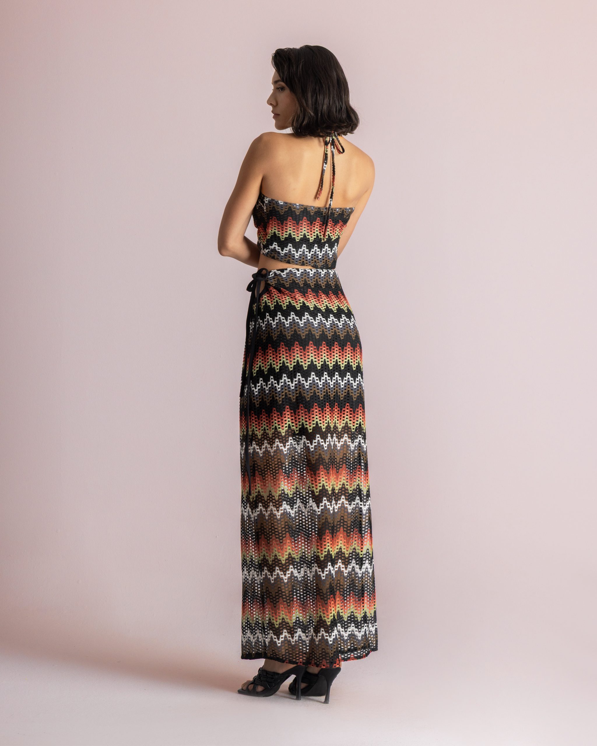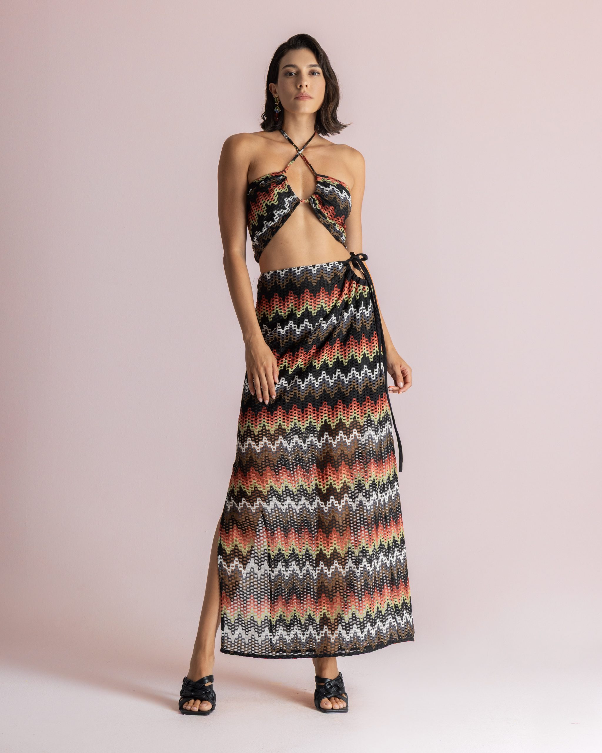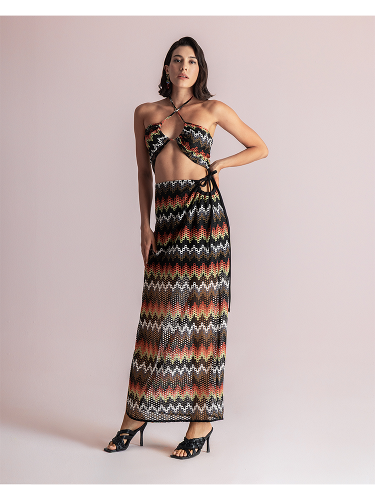 This bustier top showcases a zigzag pattern, featuring a halter neckline with delicate tie straps. The front twist detail adds dimension while the fitted structure ensures a secure and comfortable fit.