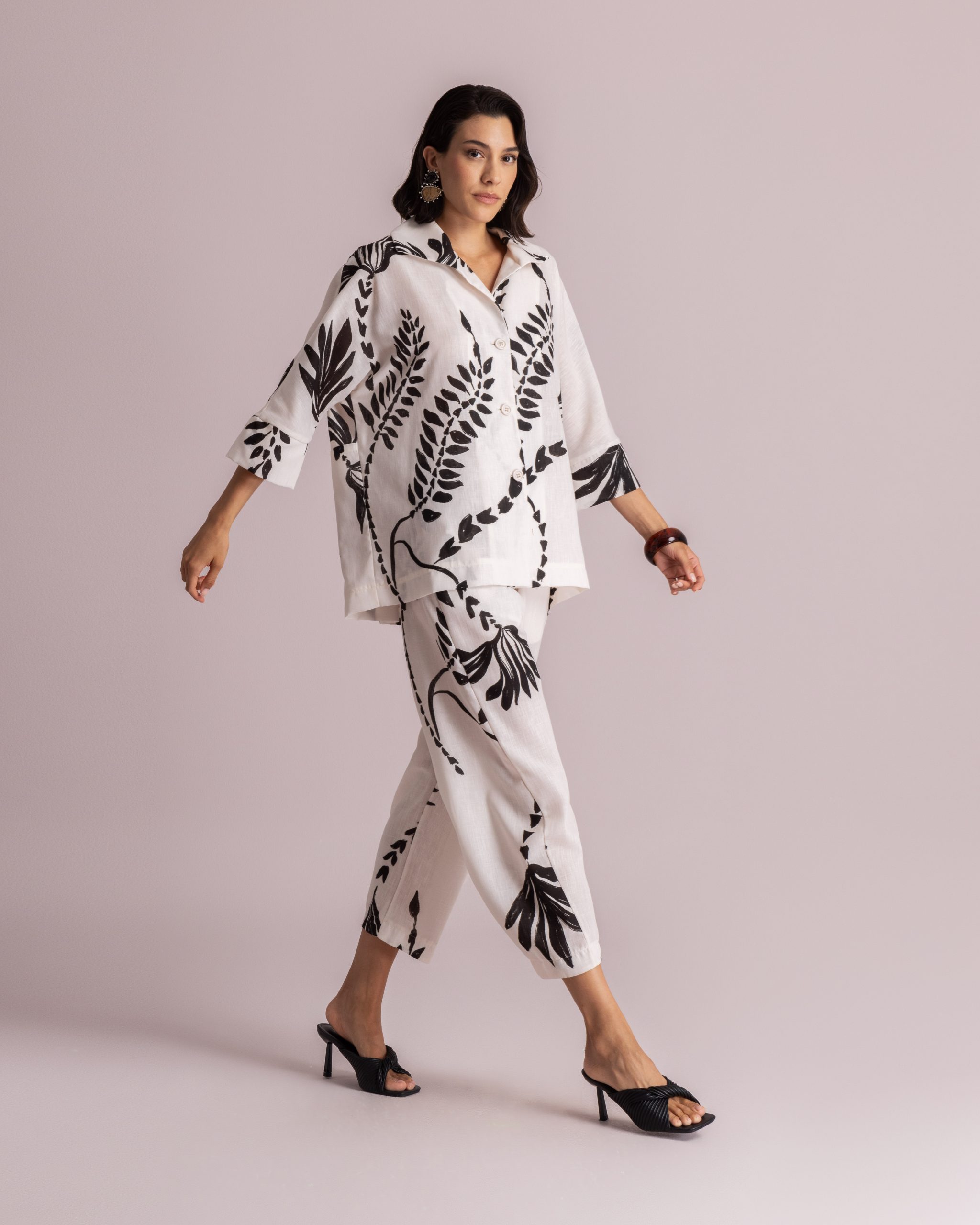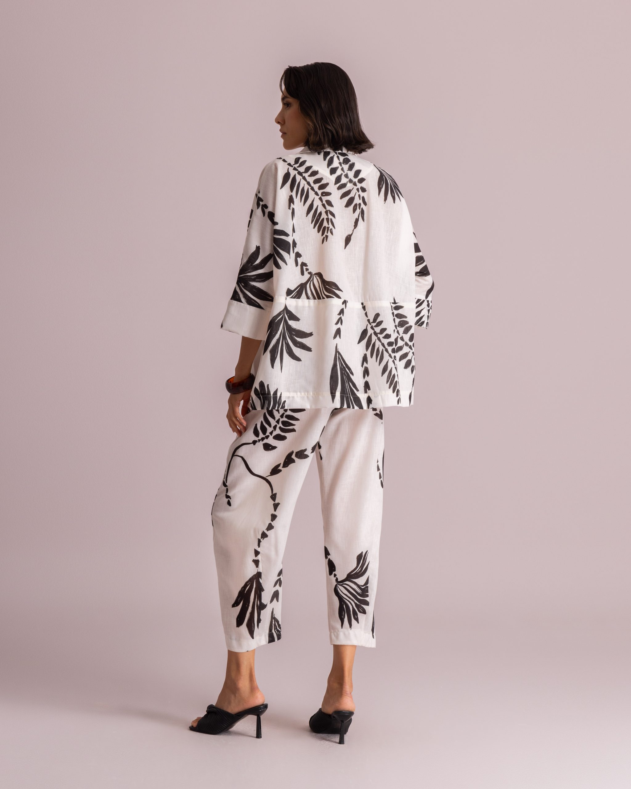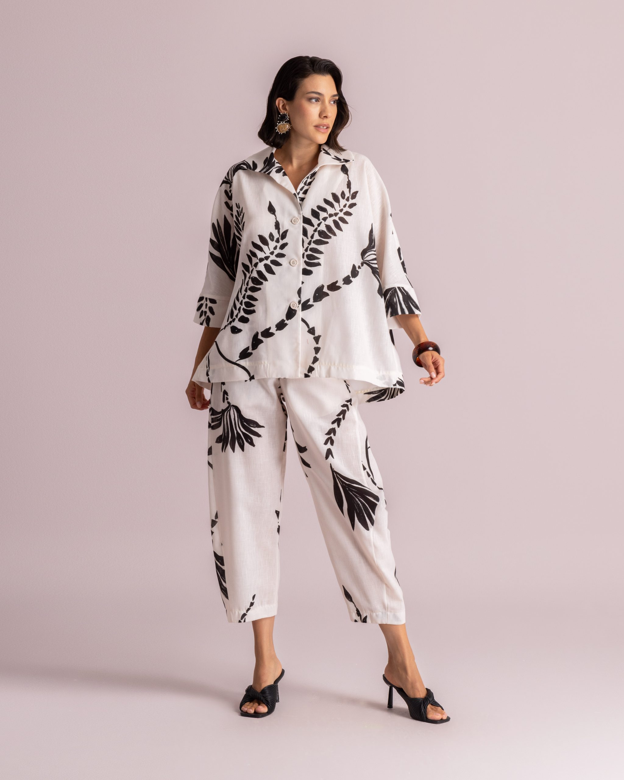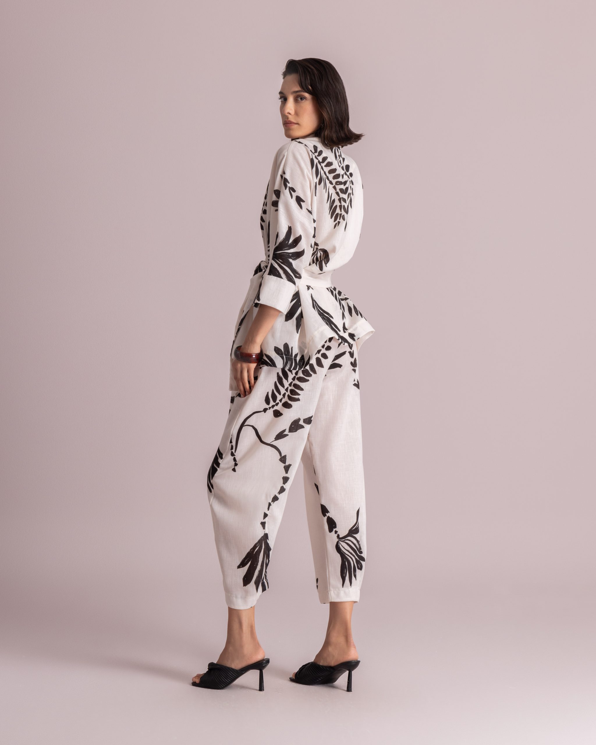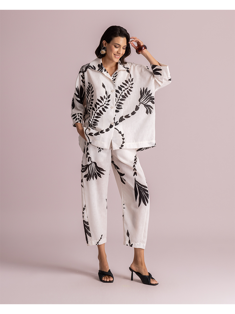 These trousers are crafted from a lightweight fabric and feature a bold black botanical print. Designed with a mid-rise waist and a relaxed, tapered leg silhouette. The ankle-length cut and soft structure make them ideal for effortless everyday wear.
