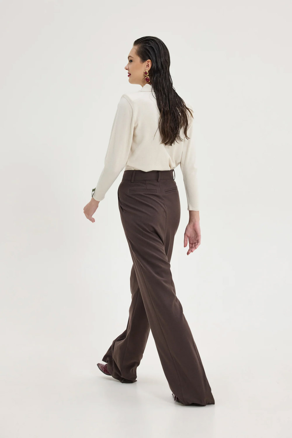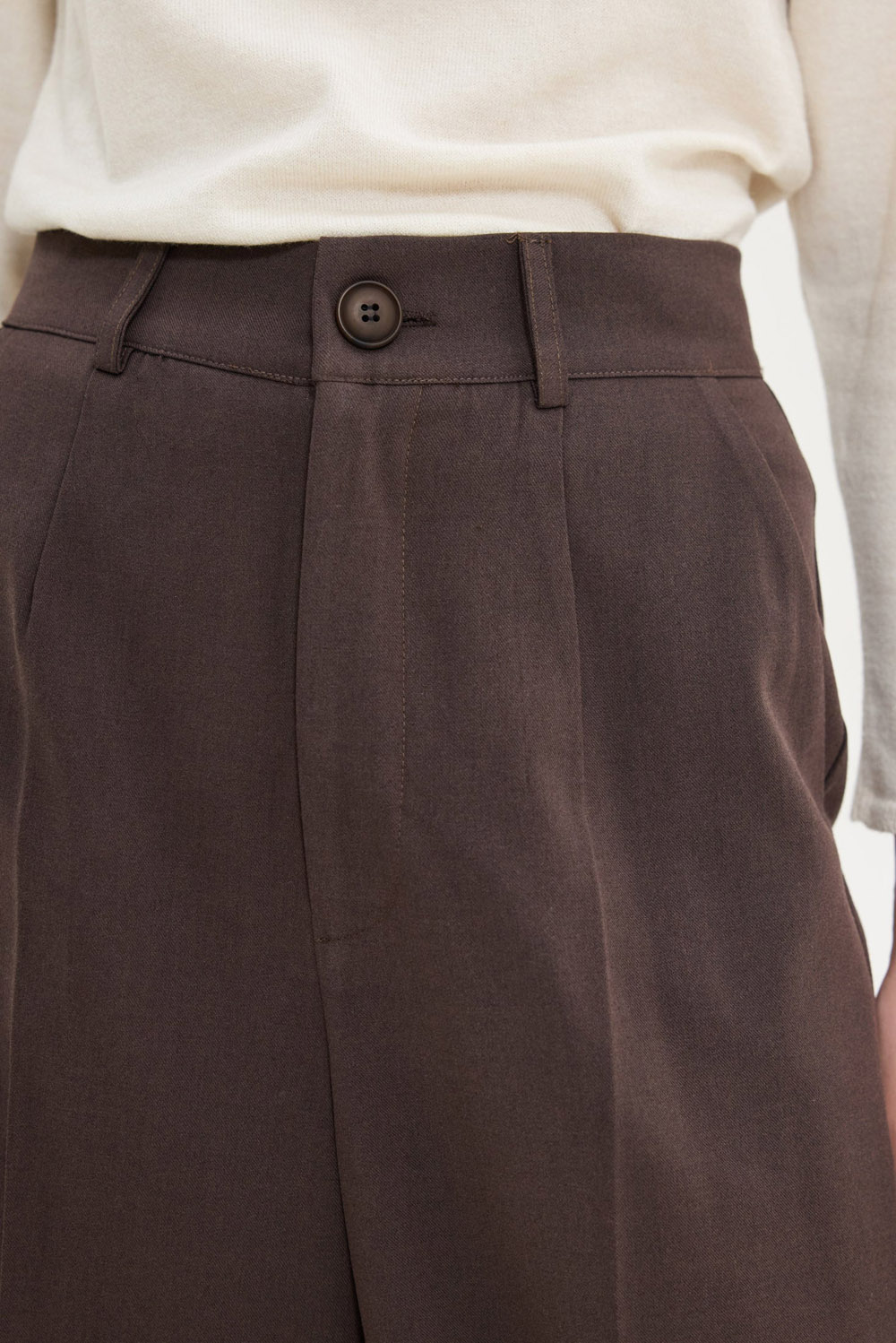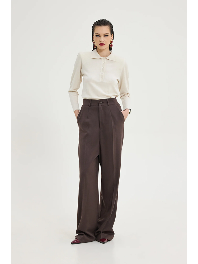 High-waisted pleated trousers designed from Hemithea in a rich brown hue for timeless sophistication. Featuring a wide and long fit, front crease and side pockets, they combine elegance with comfort. Finished with belt loops, a brown button and zip fastening for a clean, structured look — perfect for both office and refined casual outfits.
