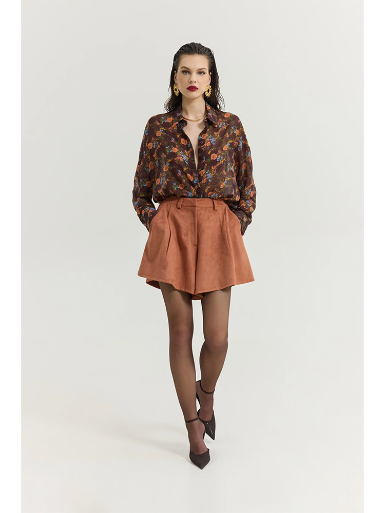 High-waisted faux suede shorts in a soft light brown tone, offering a sophisticated yet casual look. Designed from Hemithea in a wide fit with side pockets and a slightly longer back hem for added comfort and coverage. Finished with belt loops, a hook-and-zip fastening, and a smooth texture that elevates everyday styling.