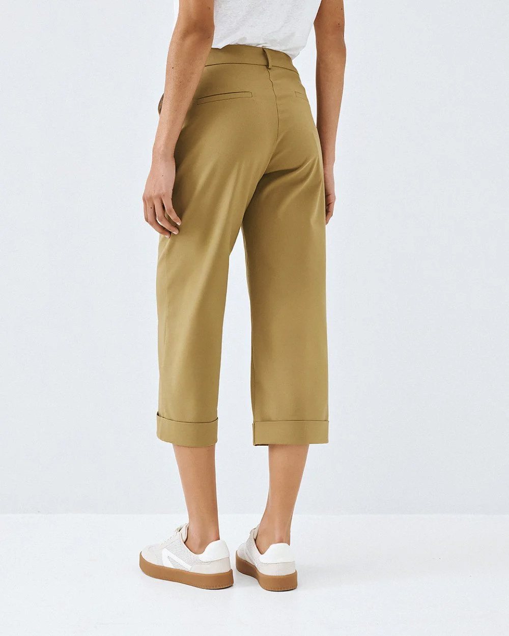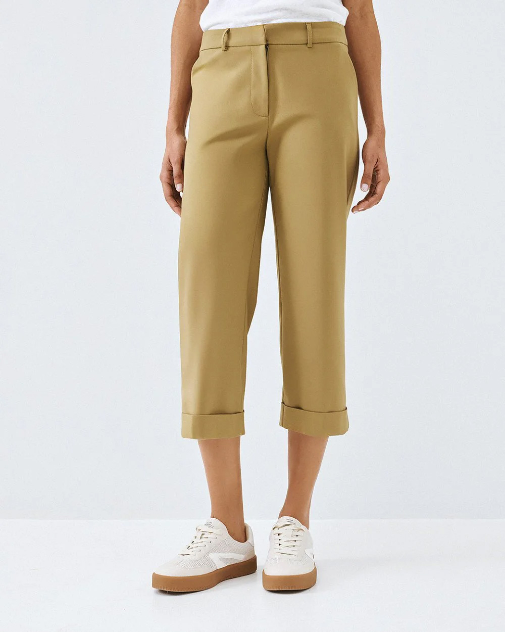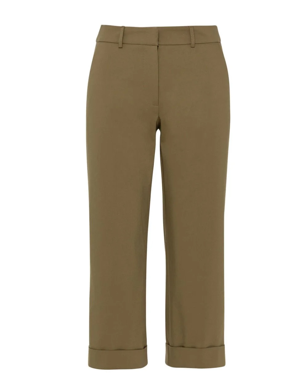 Cropped pants with side pockets, decorative welt pockets at the back, and turn-up hems. Featuring belt loops and a front zip and hook closure.