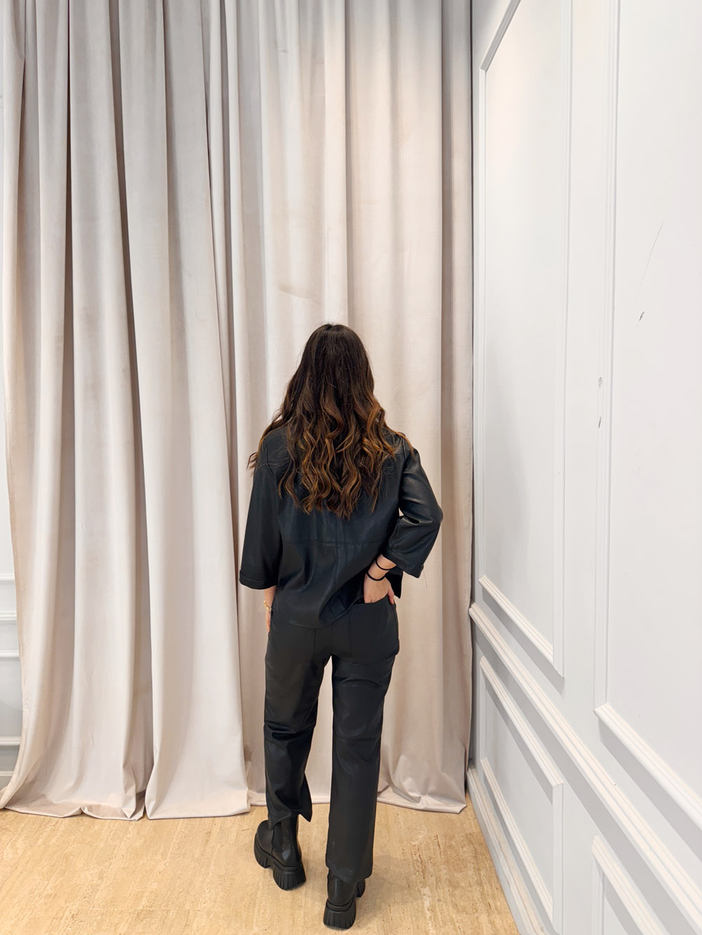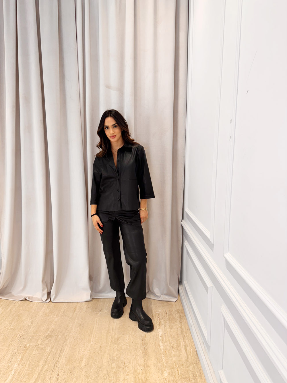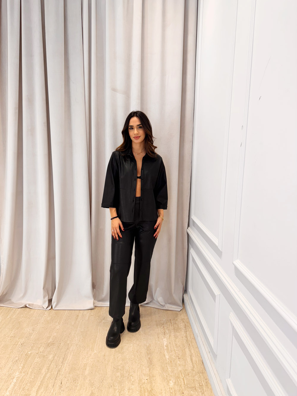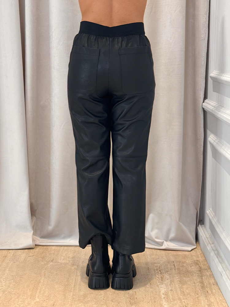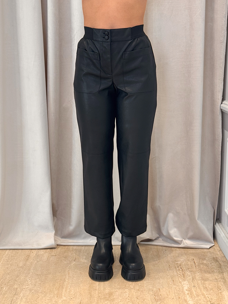 Eco-leather trousers crafted in a matte black eco-leather, they feature straight-cut leg, double-button closure and large front pockets. The back of the waistband is fully elasticated, ensuring a flexible and flattering fit.