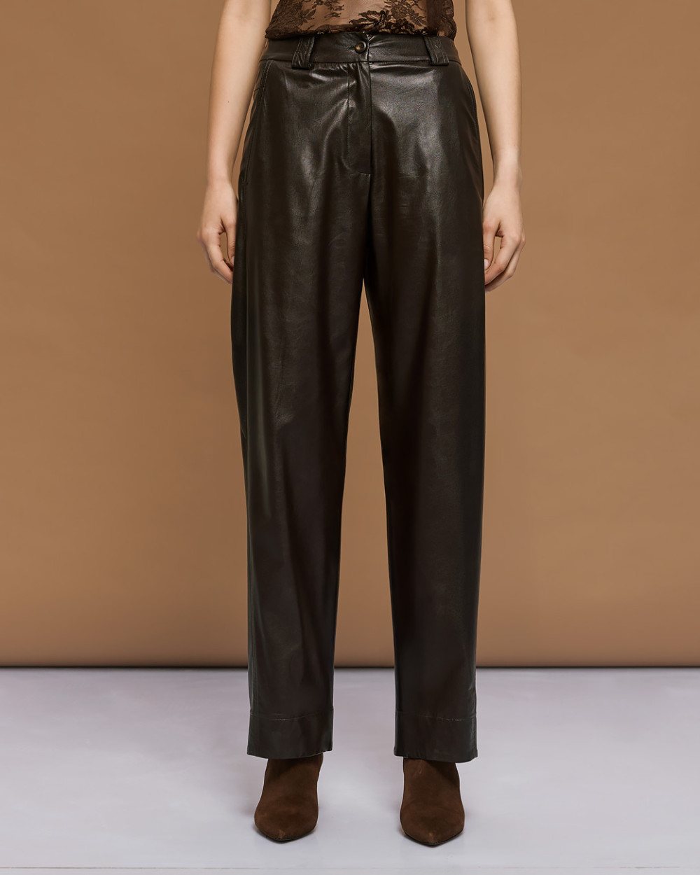 Faux leather carrot-fit pants with side pockets and back patch pockets. They feature belt loops and front button and zip closure. Pair them with the matching top from our collection for elegant looks for every occasion.