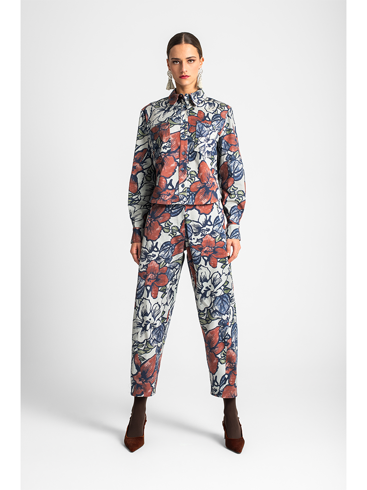 Bold and stylish, these floral printed trousers make a statement with their vibrant design and tailored silhouette. Crafted from stable fabric, they feature a straight-leg cut with a regular fit, offering both comfort and structure. Perfect for elevating your everyday wardrobe, they can be styled with the matching shirt for a striking coordinated look.