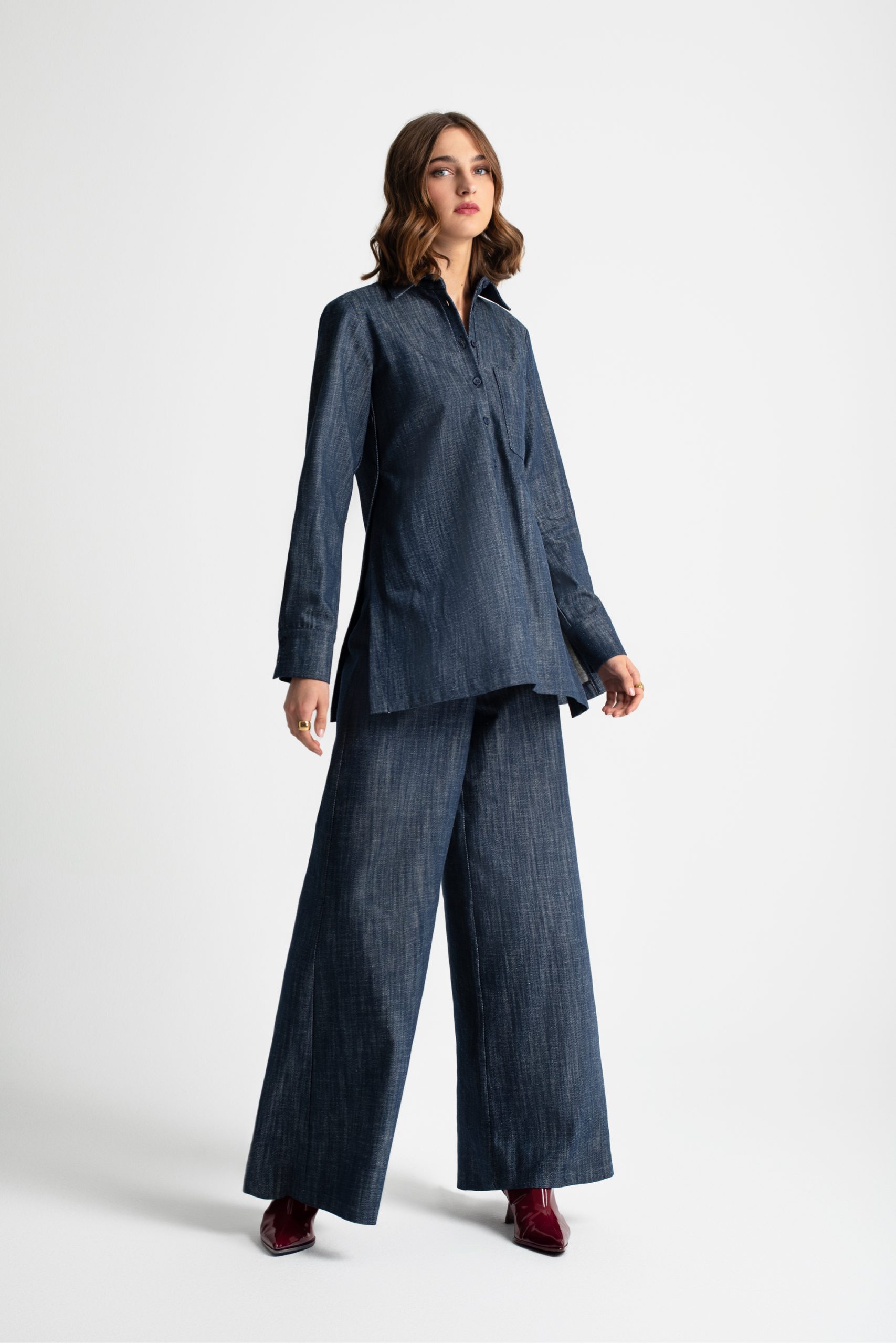 Elevate your casual wardrobe with these wide-leg denim trousers, designed to combine comfort with a bold, fashion-forward silhouette. Crafted from stable denim fabric, they feature a high-rise waist and a dramatic flared cut that elongates the figure. Perfect for pairing with tailored shirts, blouses, or knits, these trousers transition seamlessly from day to evening looks.