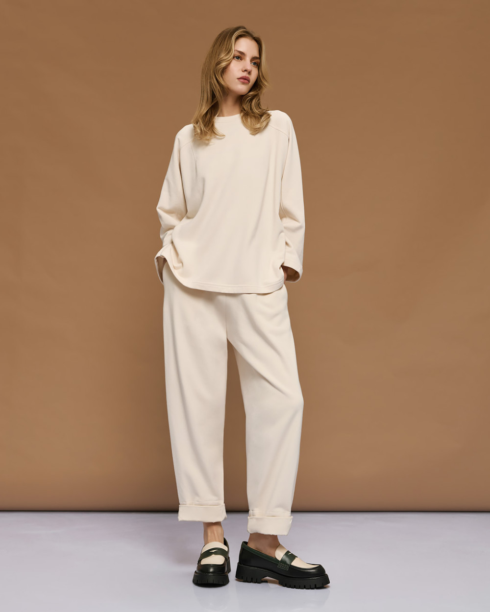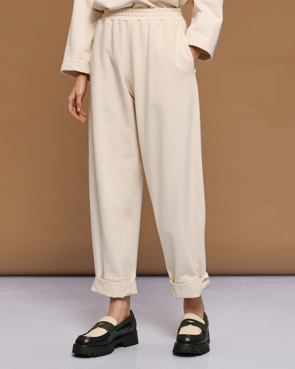 High-waist pants with an elastic waistband and turn-up hems, designed with side pockets from Access Fashion. An ideal choice for comfortable and stylish looks.