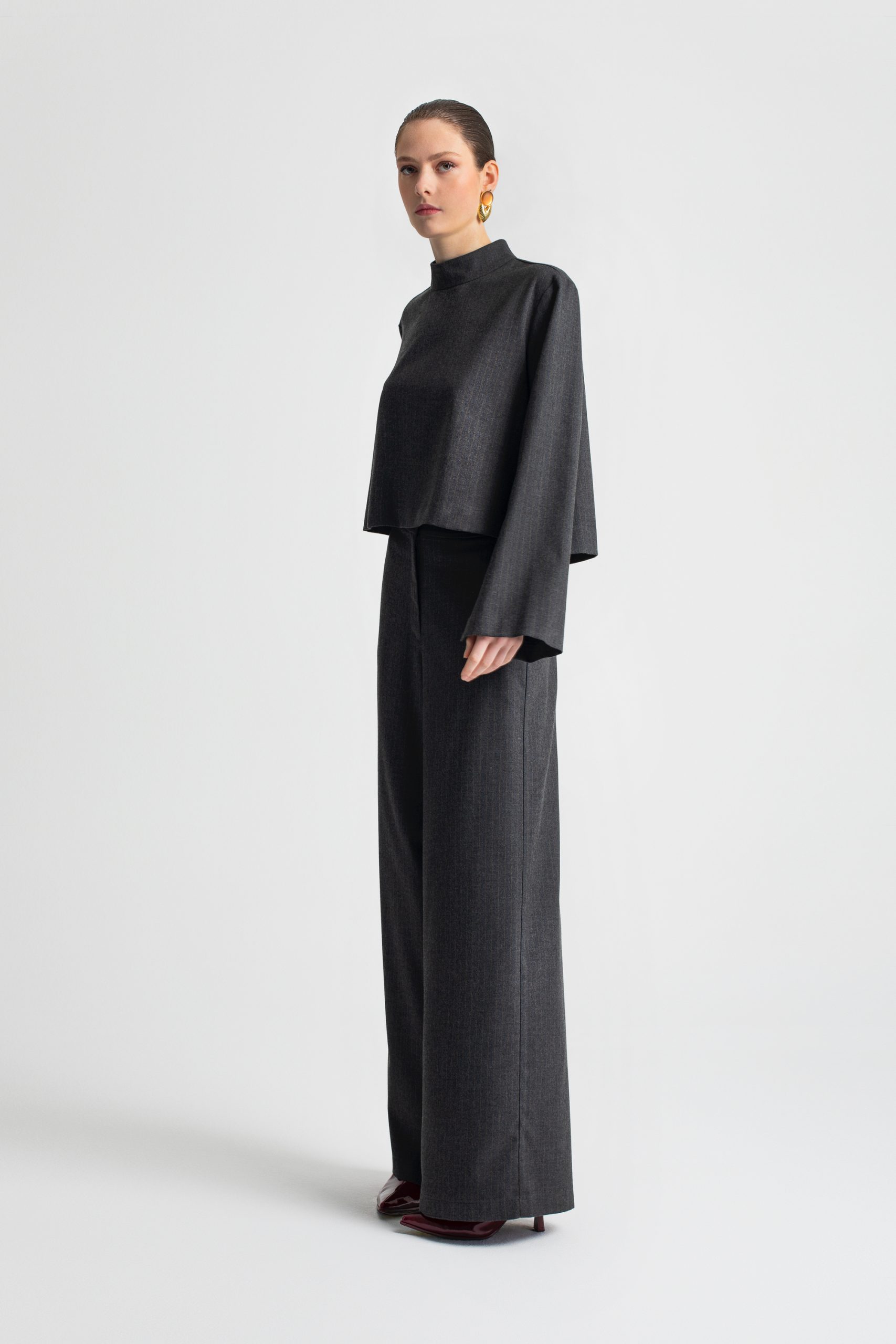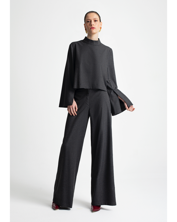 Elegant and versatile, these flared trousers are designed to elongate the silhouette while offering effortless sophistication. Crafted from stable fabric, they feature a high-rise waist and a wide-leg cut that flows beautifully with every step. Perfect for day-to-night wear, they can be styled with blouses, shirts, or the coordinating top for a modern, polished look.