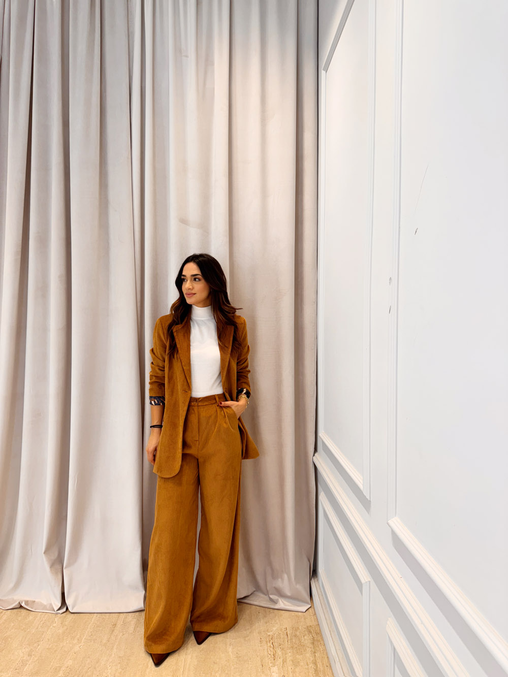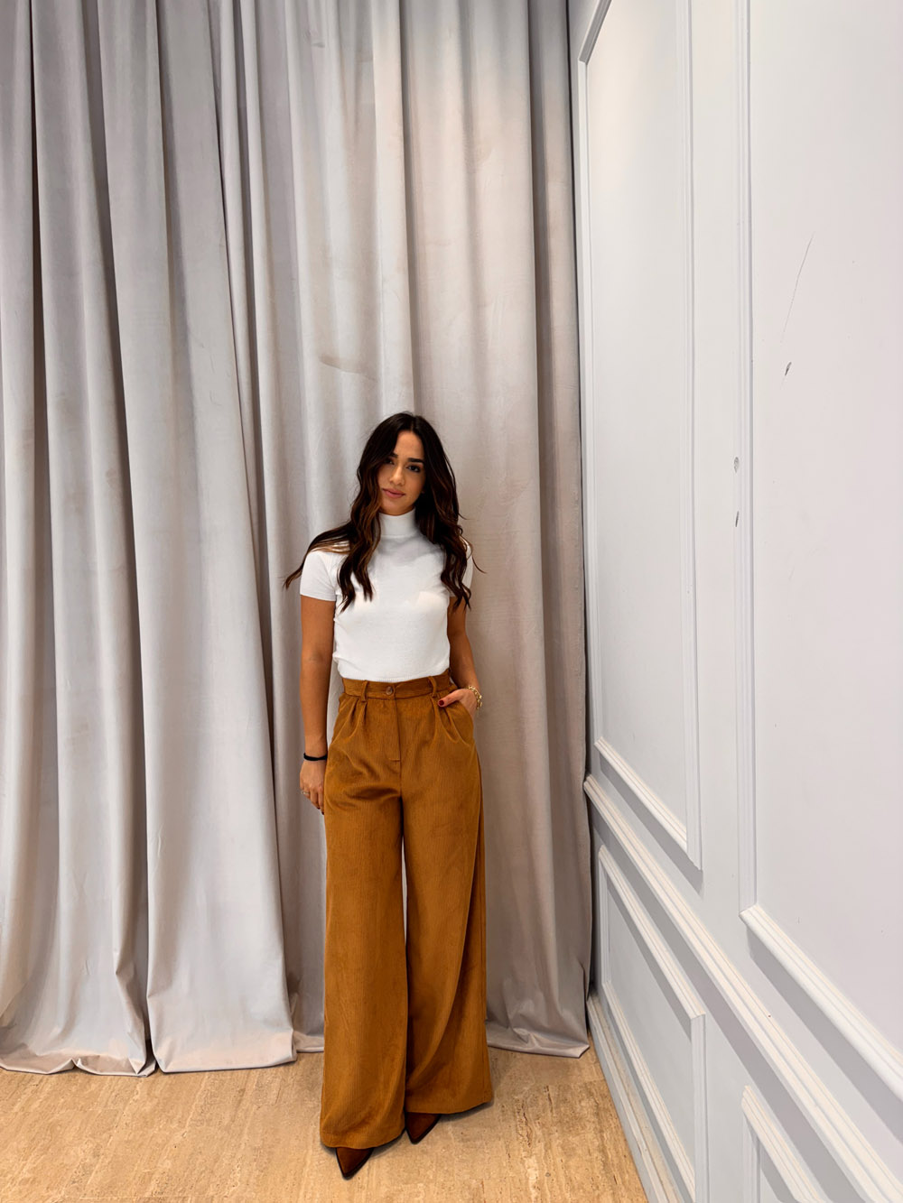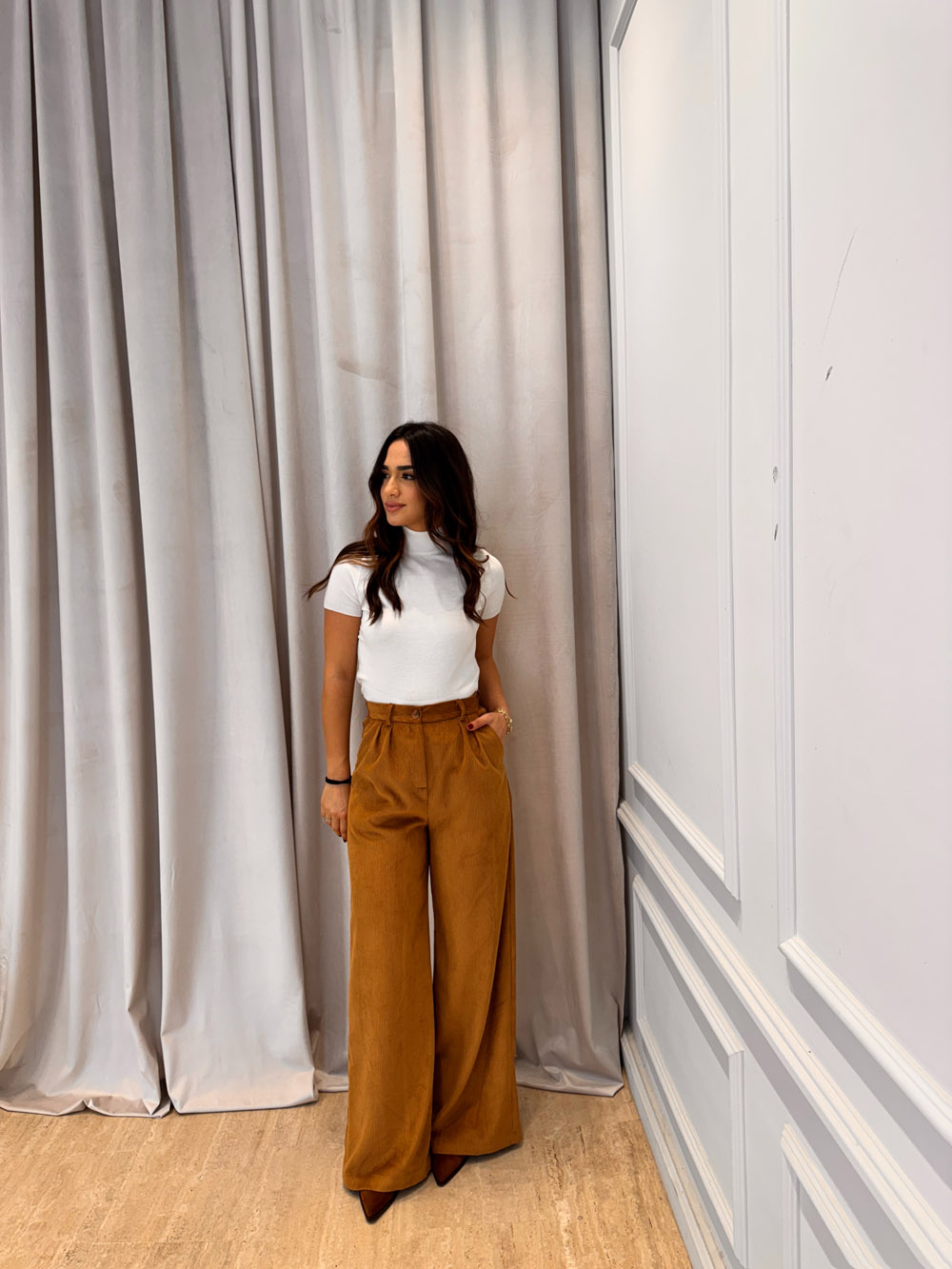 Corduroy trousers crafted from soft, finely ribbed corduroy, the high-waisted silhouette elongates the legs, while the wide-leg cut adds movement and effortless chic. Featuring a front button-and-zip closure, subtle pleating, and practical side pockets.