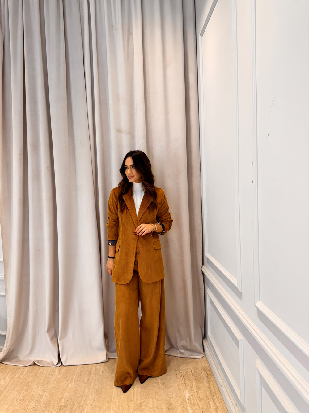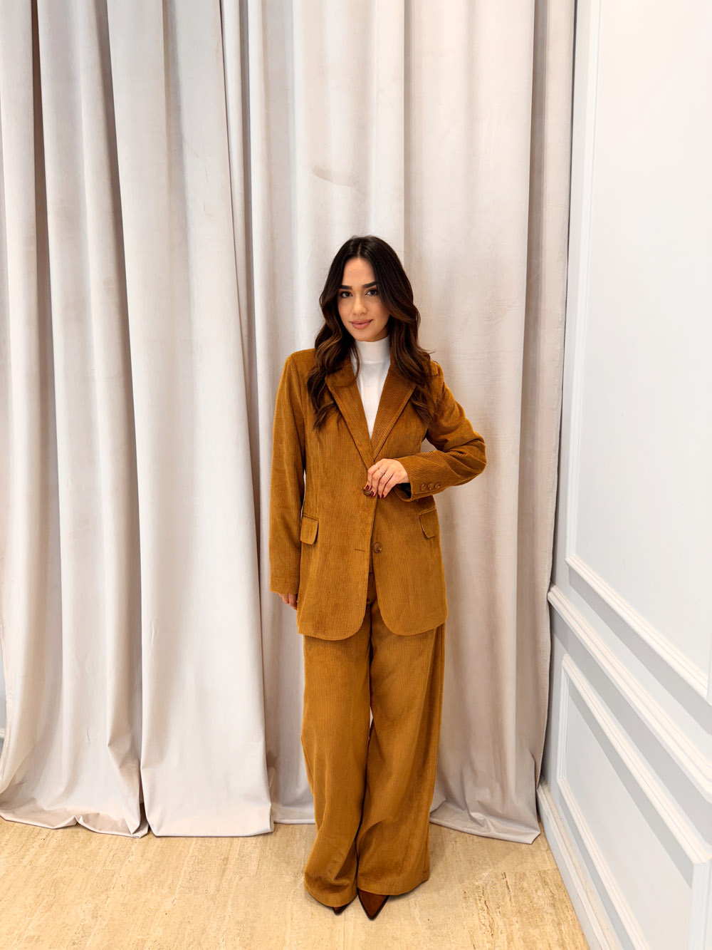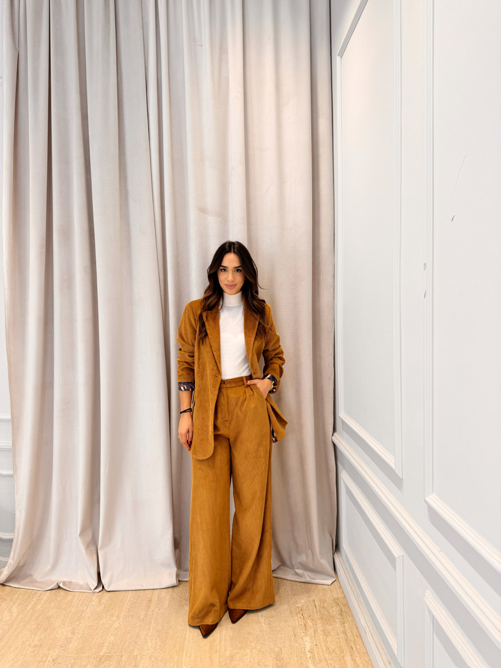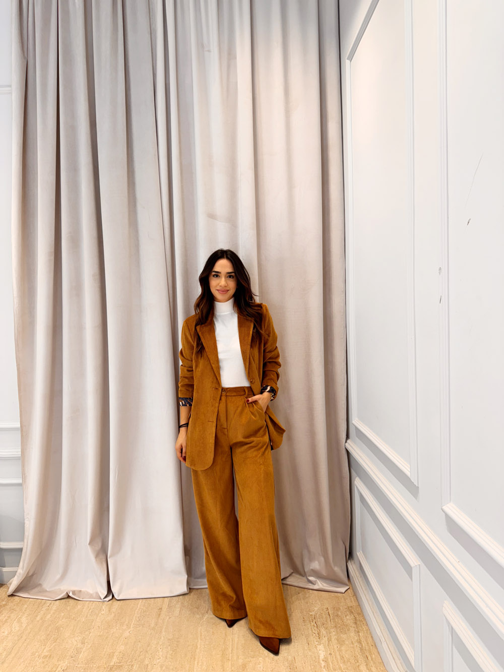 Corduroy trousers crafted from soft, finely ribbed corduroy, the high-waisted silhouette elongates the legs, while the wide-leg cut adds movement and effortless chic. Featuring a front button-and-zip closure, subtle pleating, and practical side pockets.