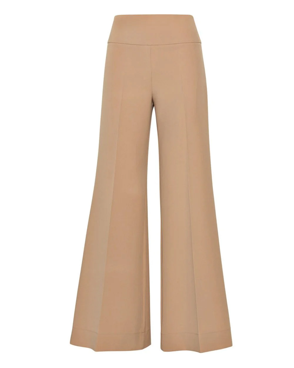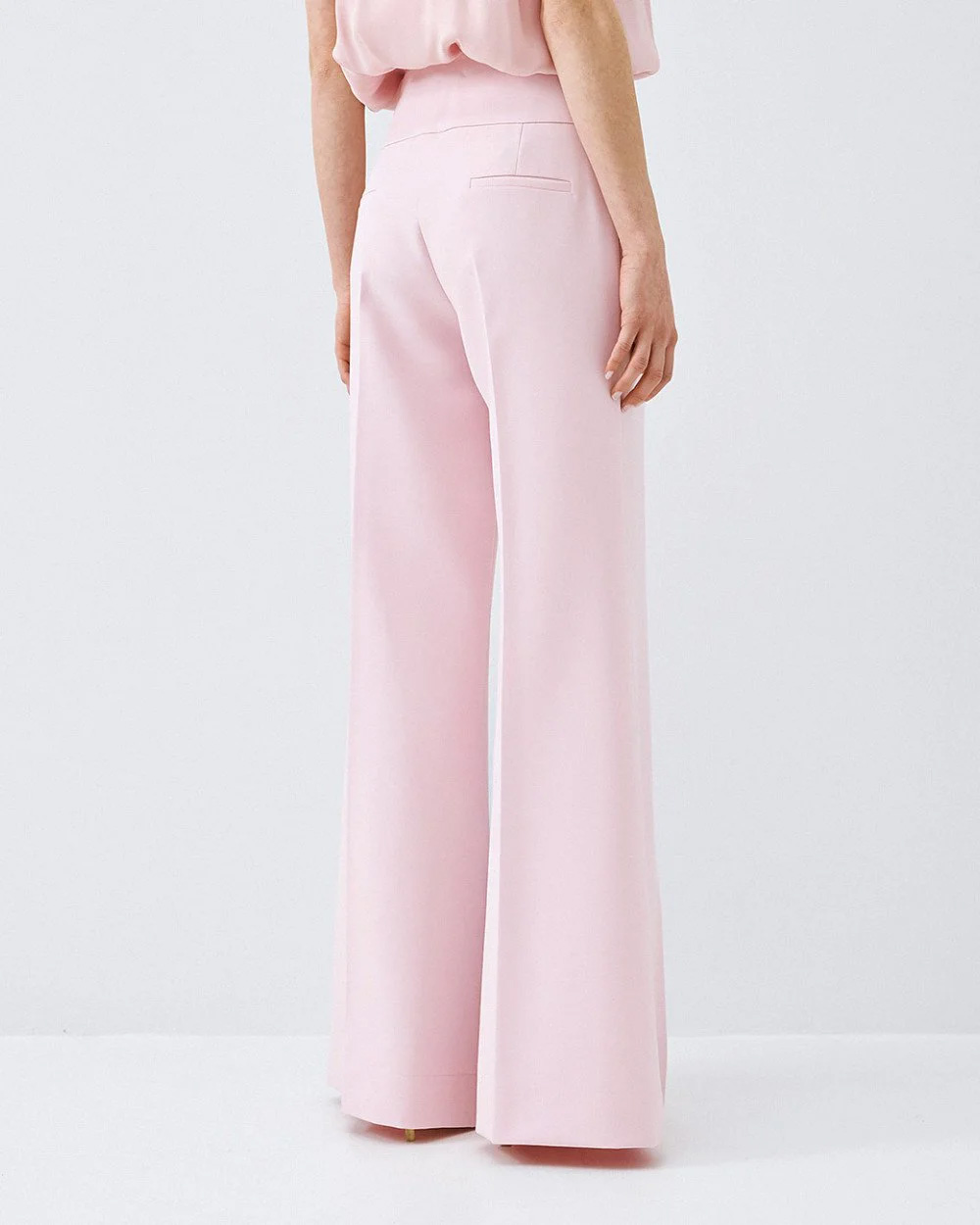 High-waisted flared pants with decorative welt pockets at the back, a front crease detail, and a side zip closure.