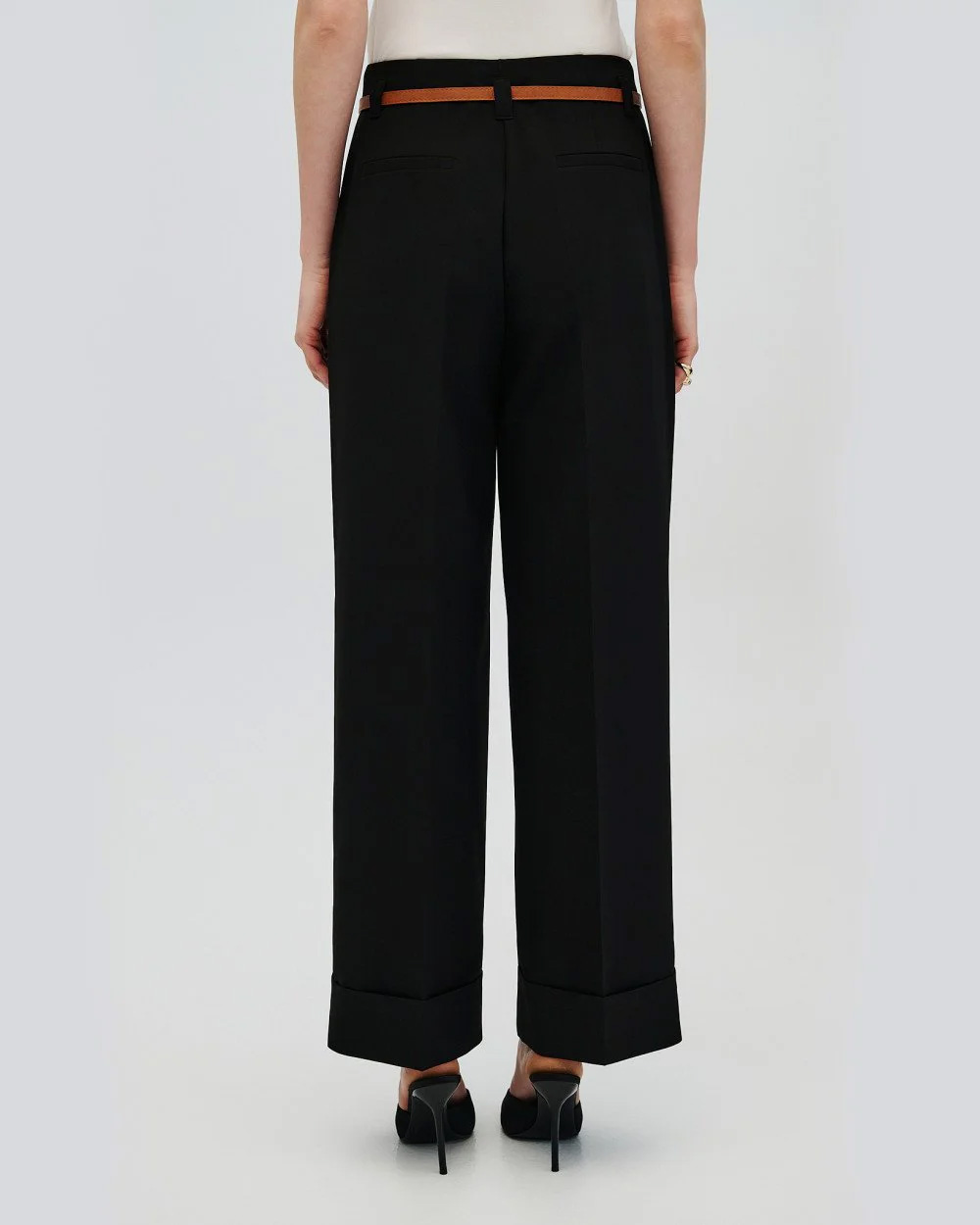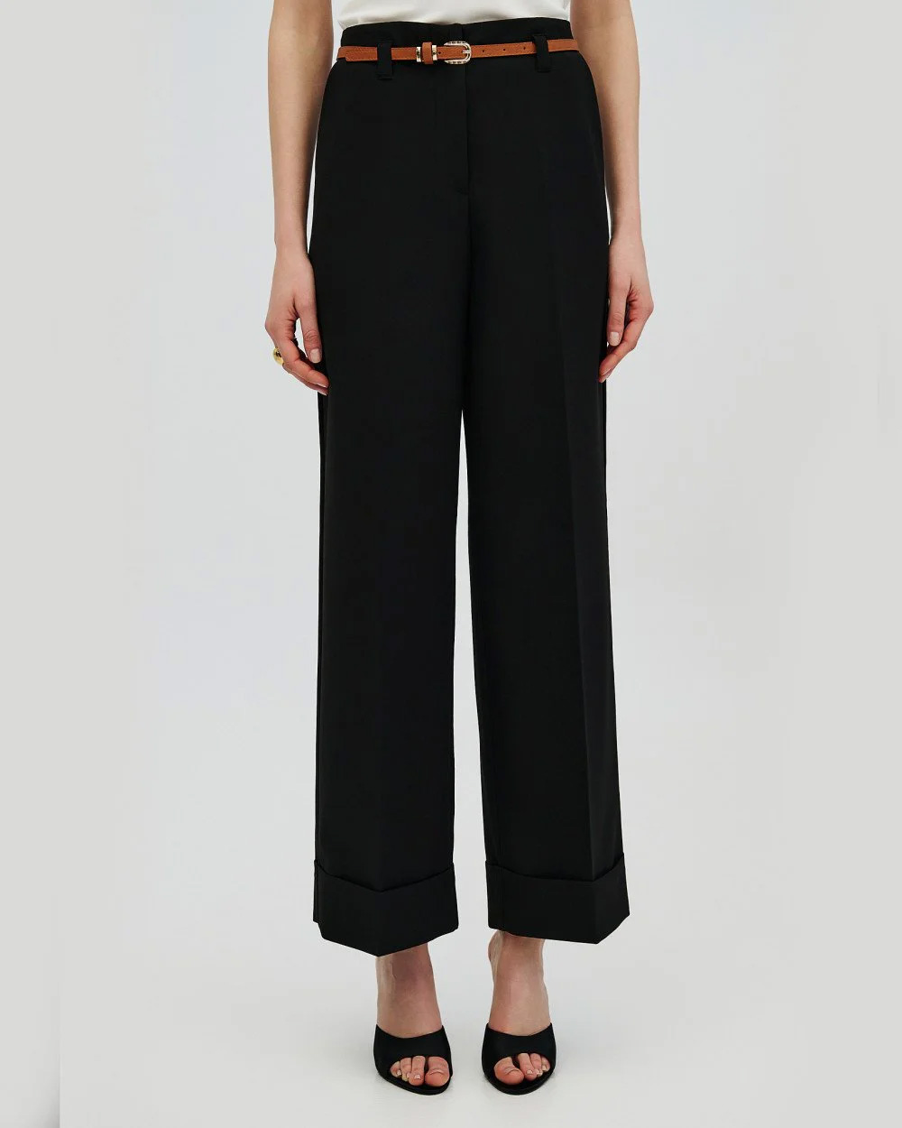High-waisted pants with turn-up hems, belt loops, and a detachable faux leather belt with a metallic buckle. Featuring side pockets and a front zip and hook closure.