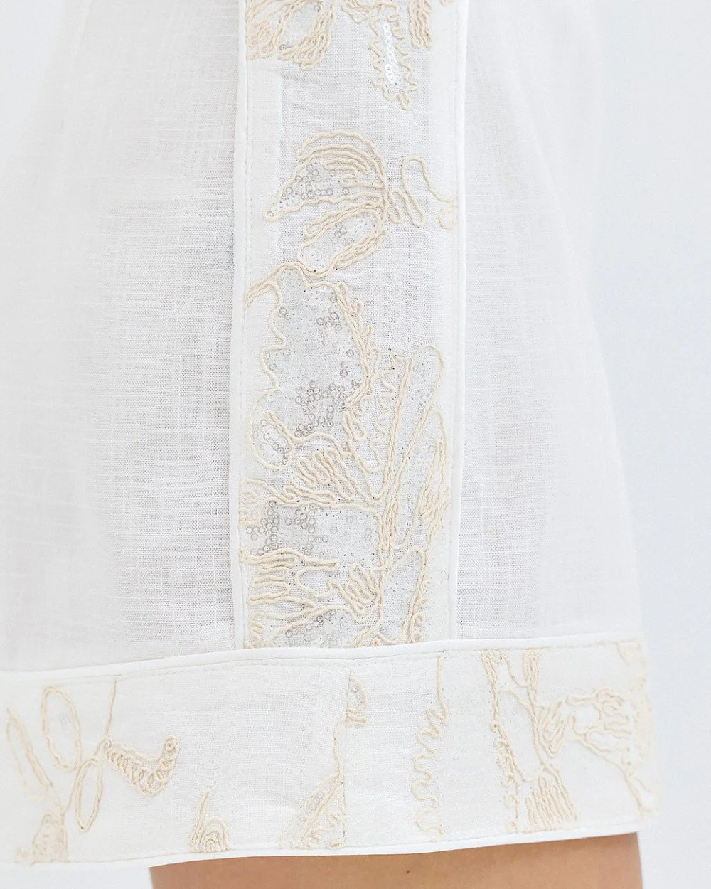 High-waisted shorts with embroidery, sequins and a back zip closure.