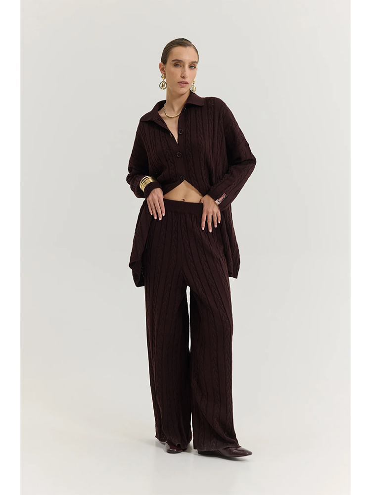 The Palermo pants from Hemithea are cozy, knit trousers designed for effortless comfort and style. Featuring a braided pattern, elasticated waistband, and wide-leg fit, they offer a relaxed silhouette while maintaining a polished look. The rich dark brown color makes them versatile for both casual and refined outfits, wheras the black version is a wardrobe essential perfect for day, comfy looks.