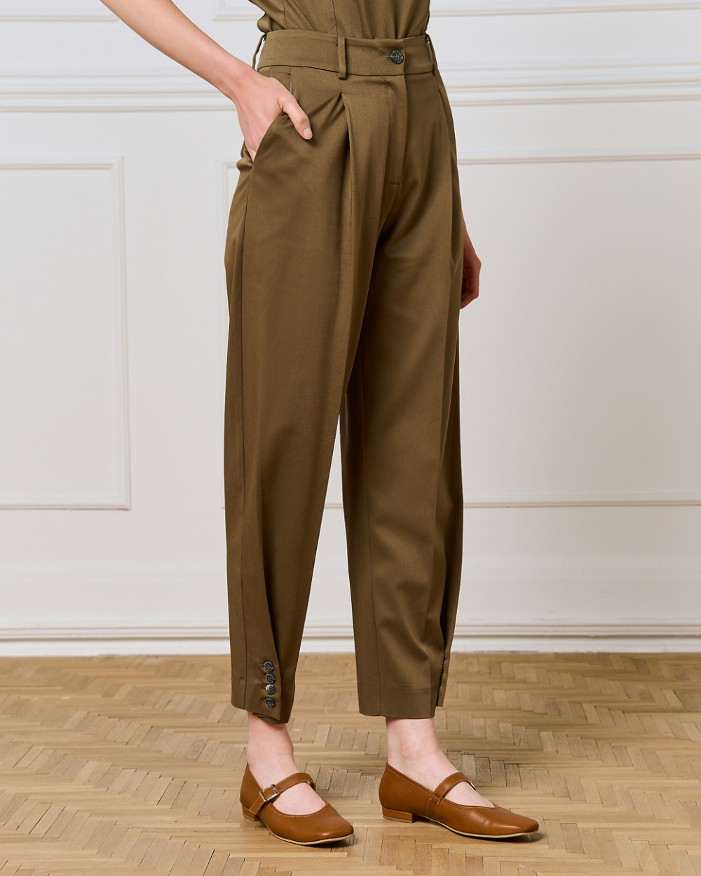 Carrot-fit pants with pleats, side pockets and buttoned hem. They feature belt loops and front zip and button closure. A perfect choice for elegant all-day looks.
