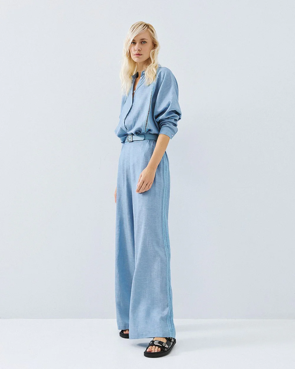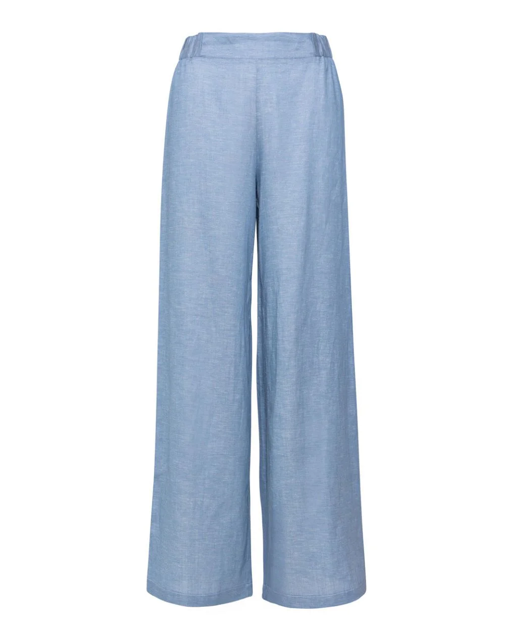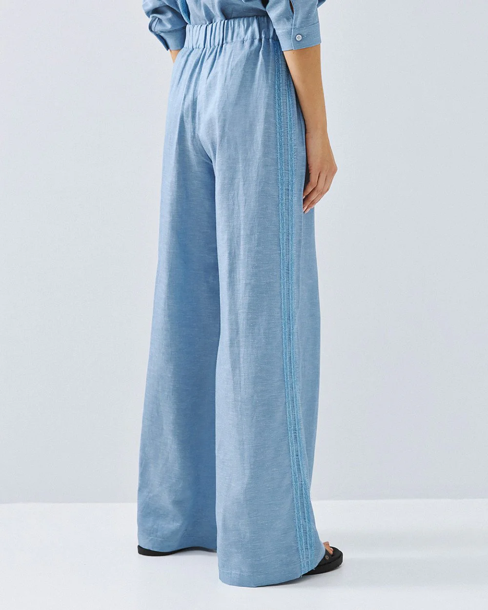 These wide-leg pants offer a relaxed silhouette, crafted in a soft, lightweight fabric. Subtle textured side panels add a touch of detail and elongate the legs.