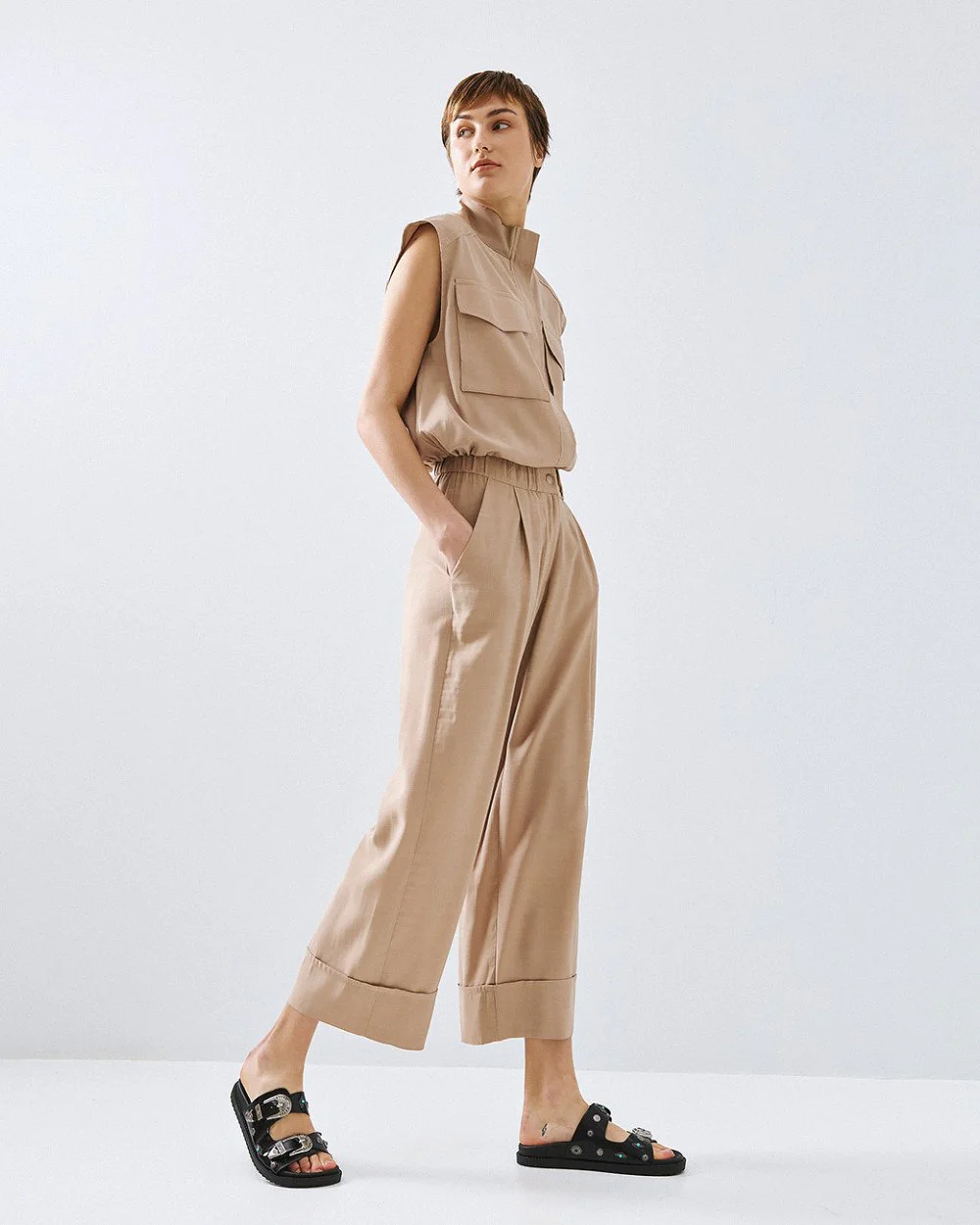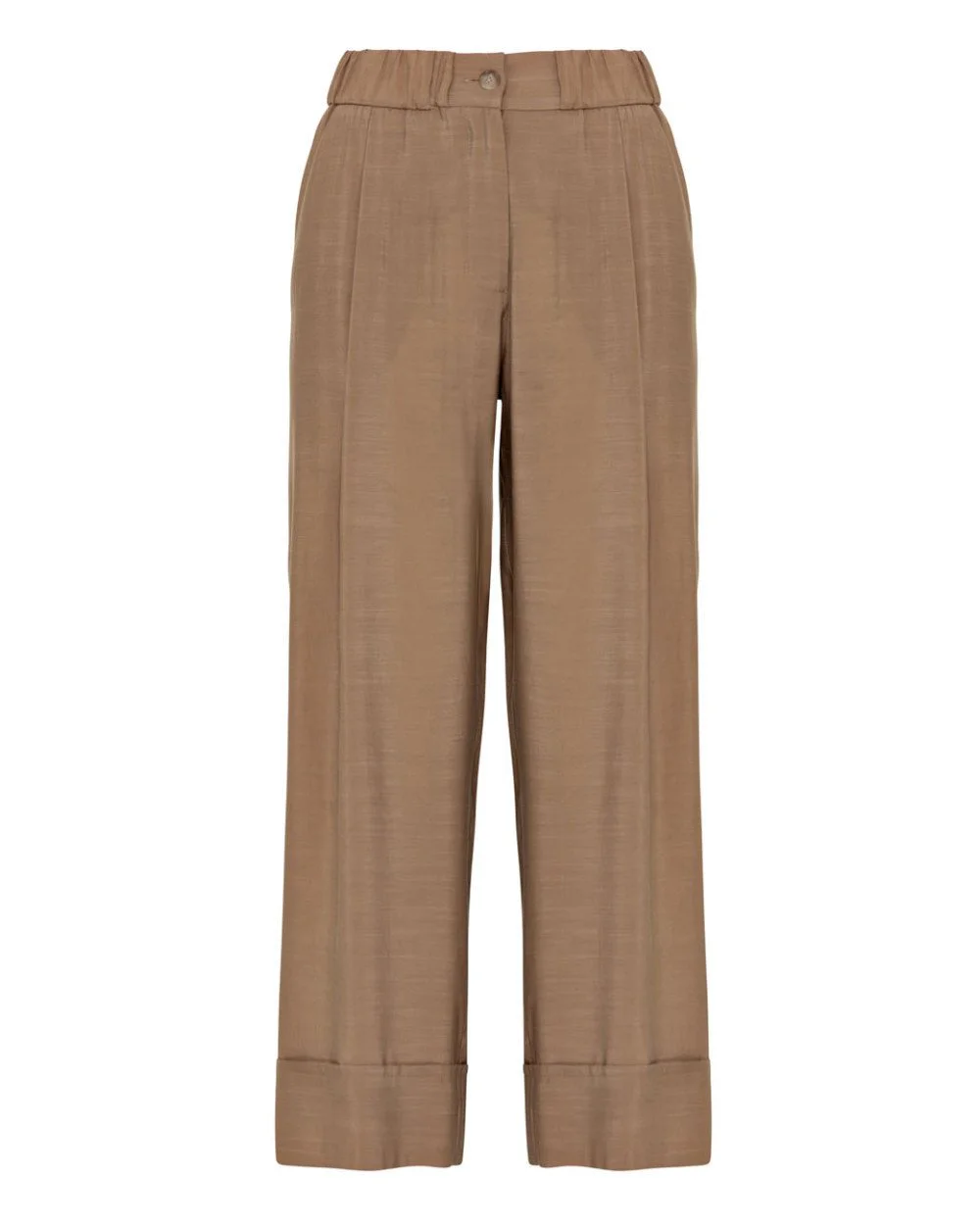 Pants with an elastic waistband and front pleats. Featuring side pockets, turn-up hems and a button and zip fastening at the front.