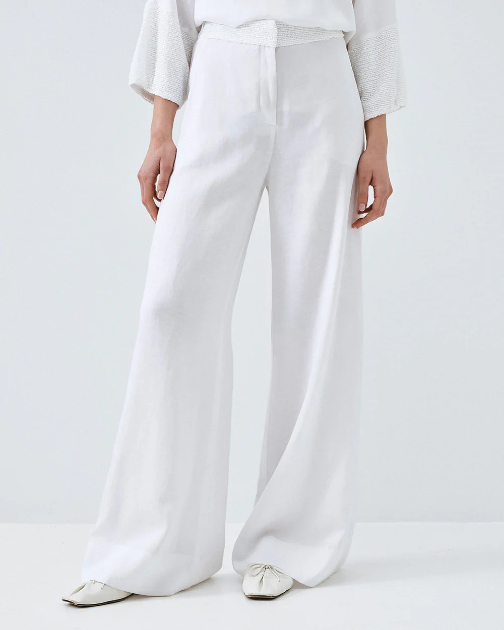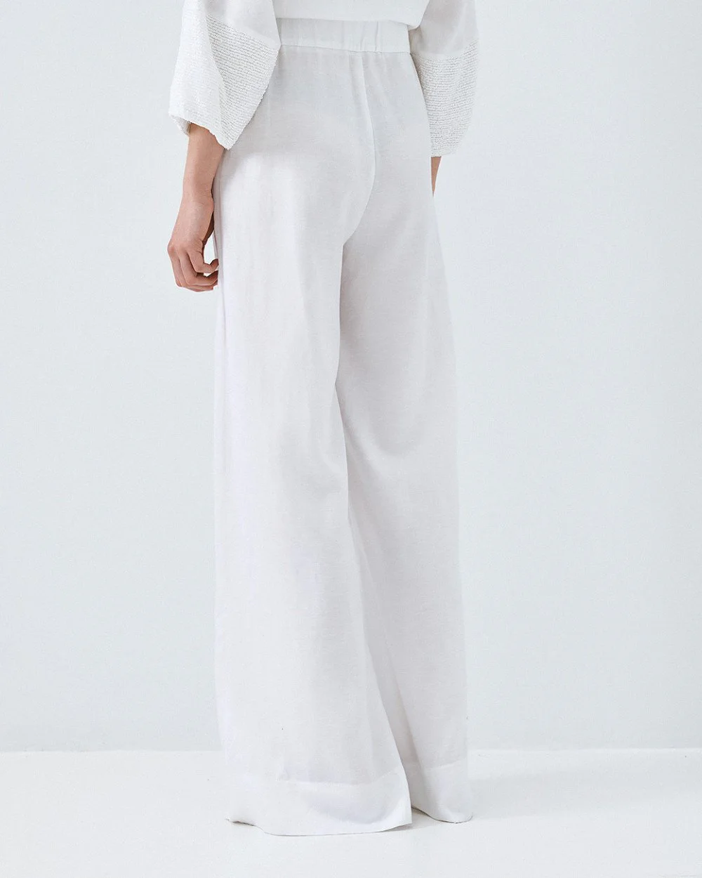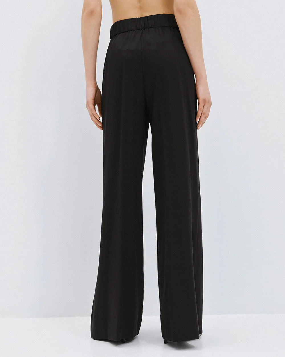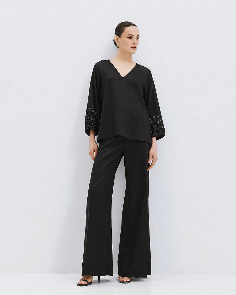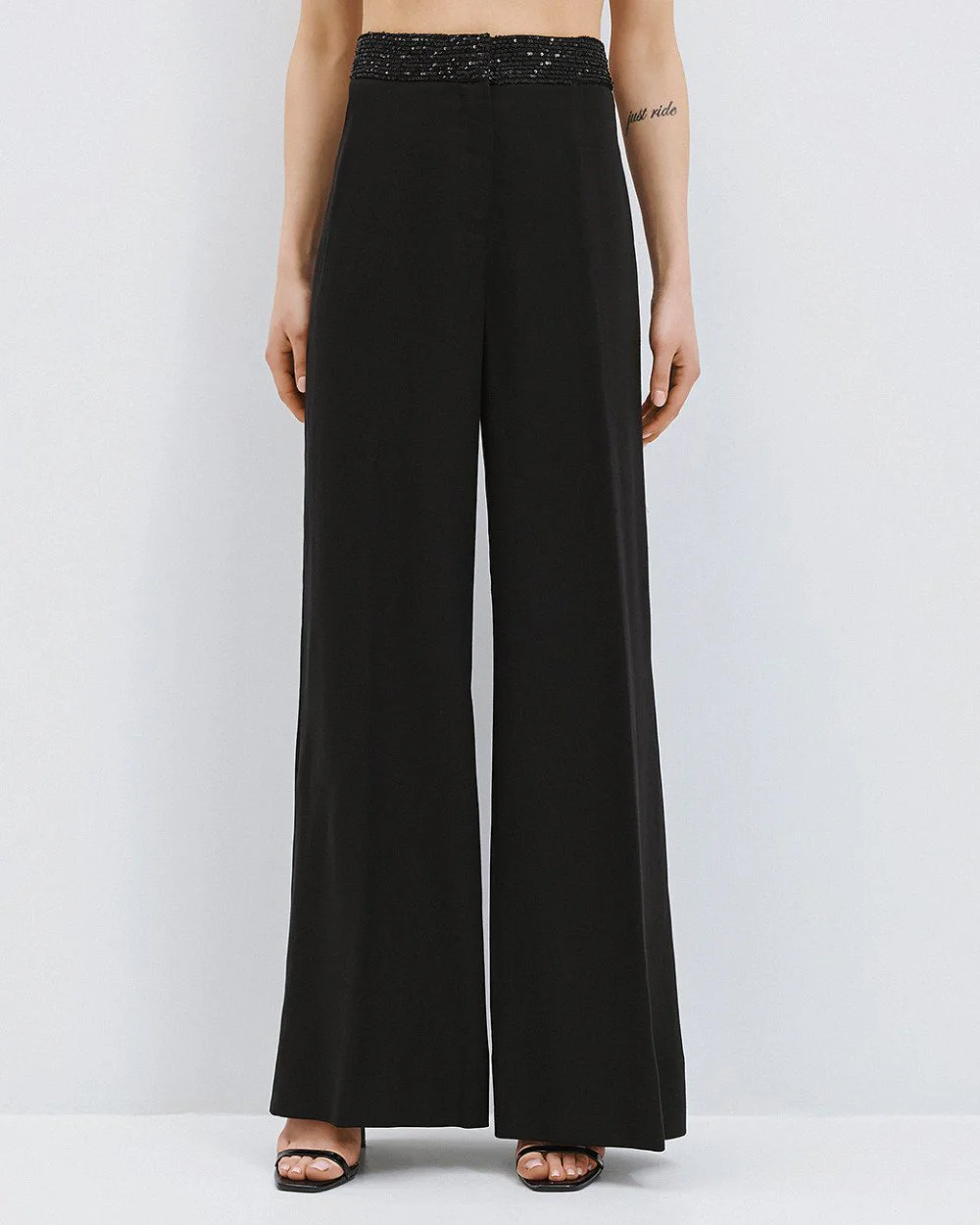 Wide-leg pants with an elastic waistband featuring embroidered sequins, side pockets and a front zip and hook-and-eye closure.