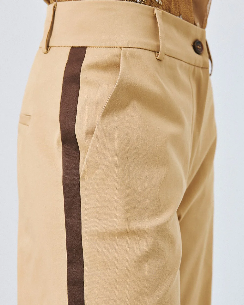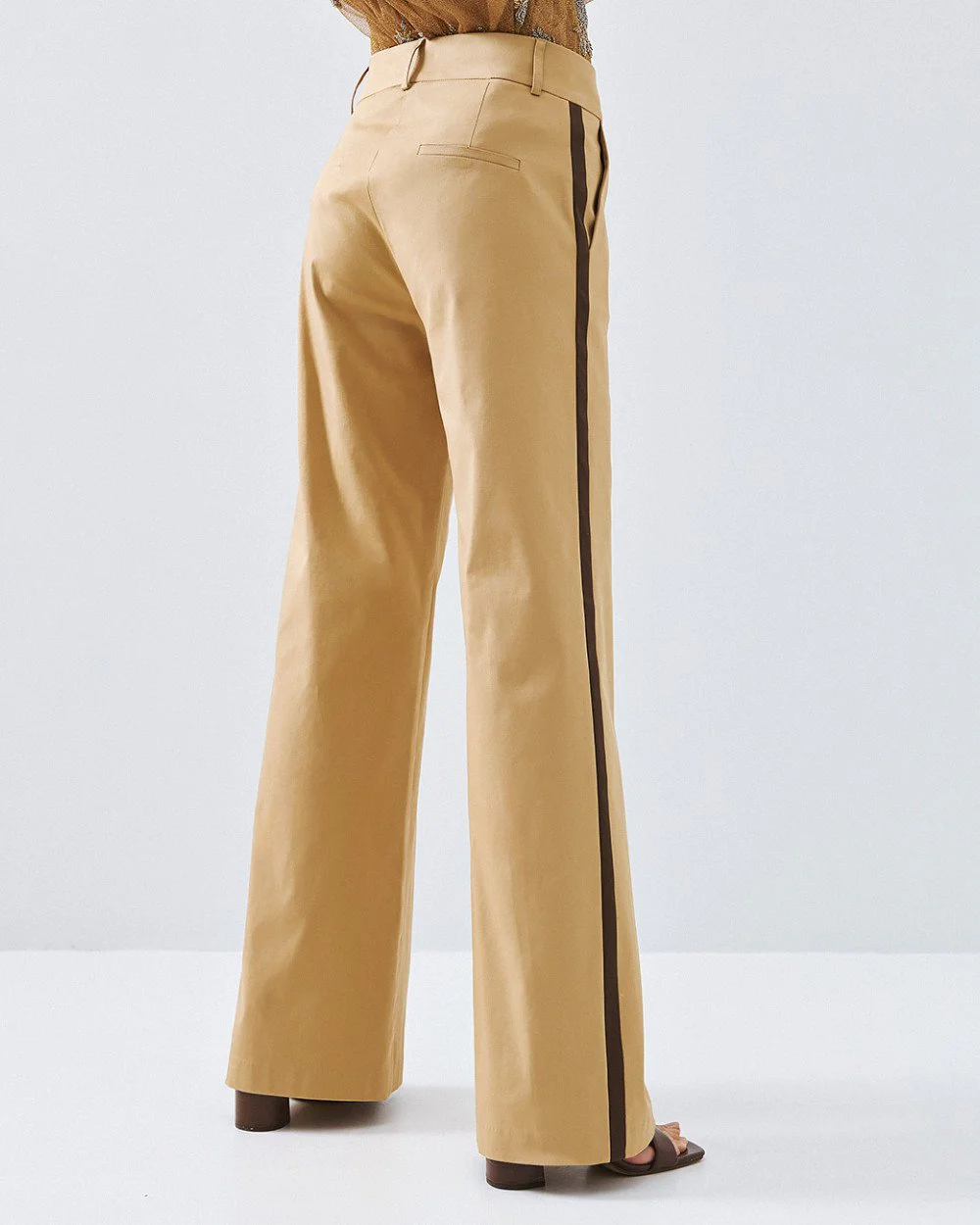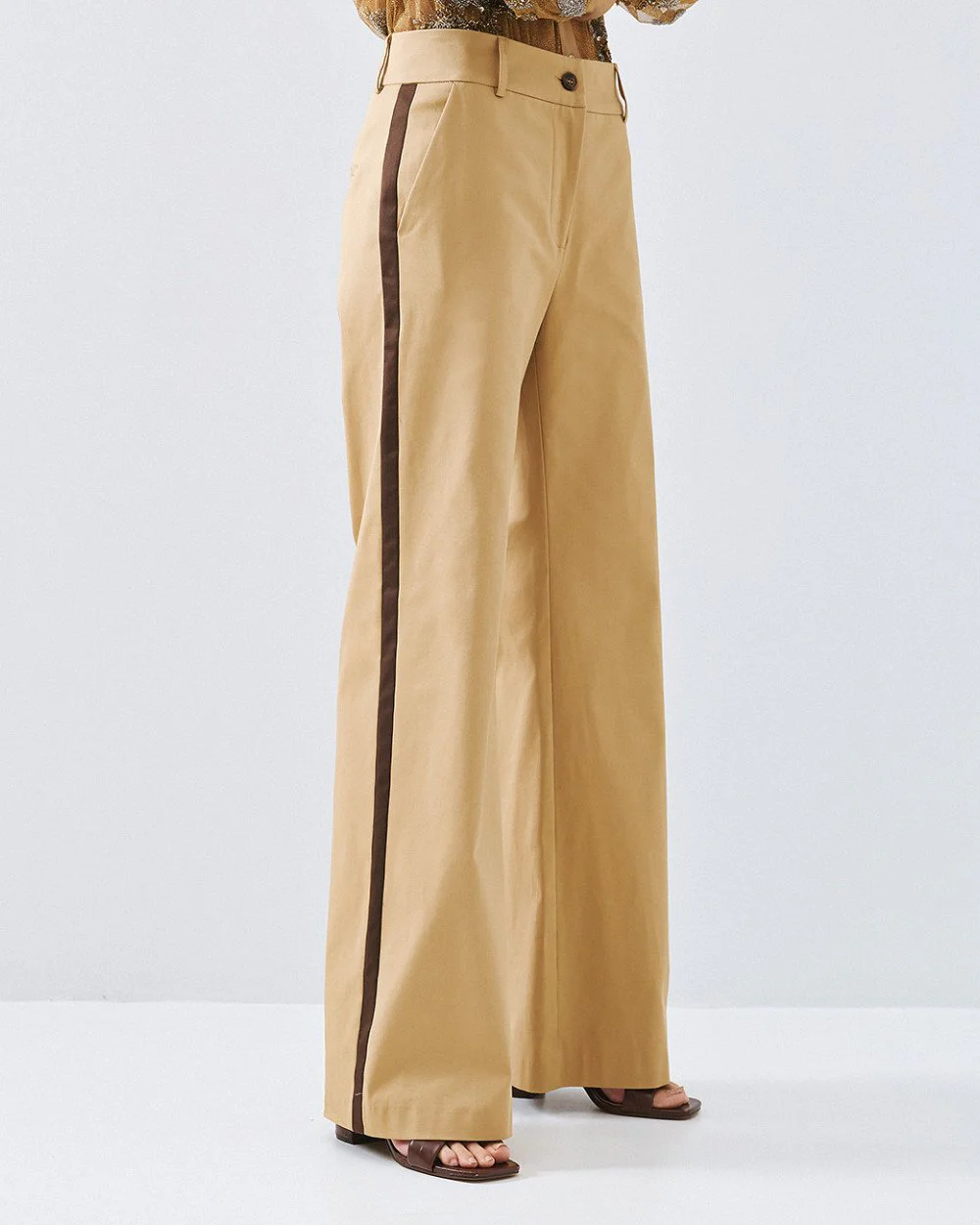 High-waisted wide-leg pants with side stripe details and belt loops. Feature side pockets, decorative welt pockets at the back and a zip and button fastening at the front.