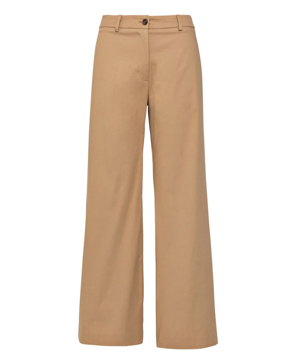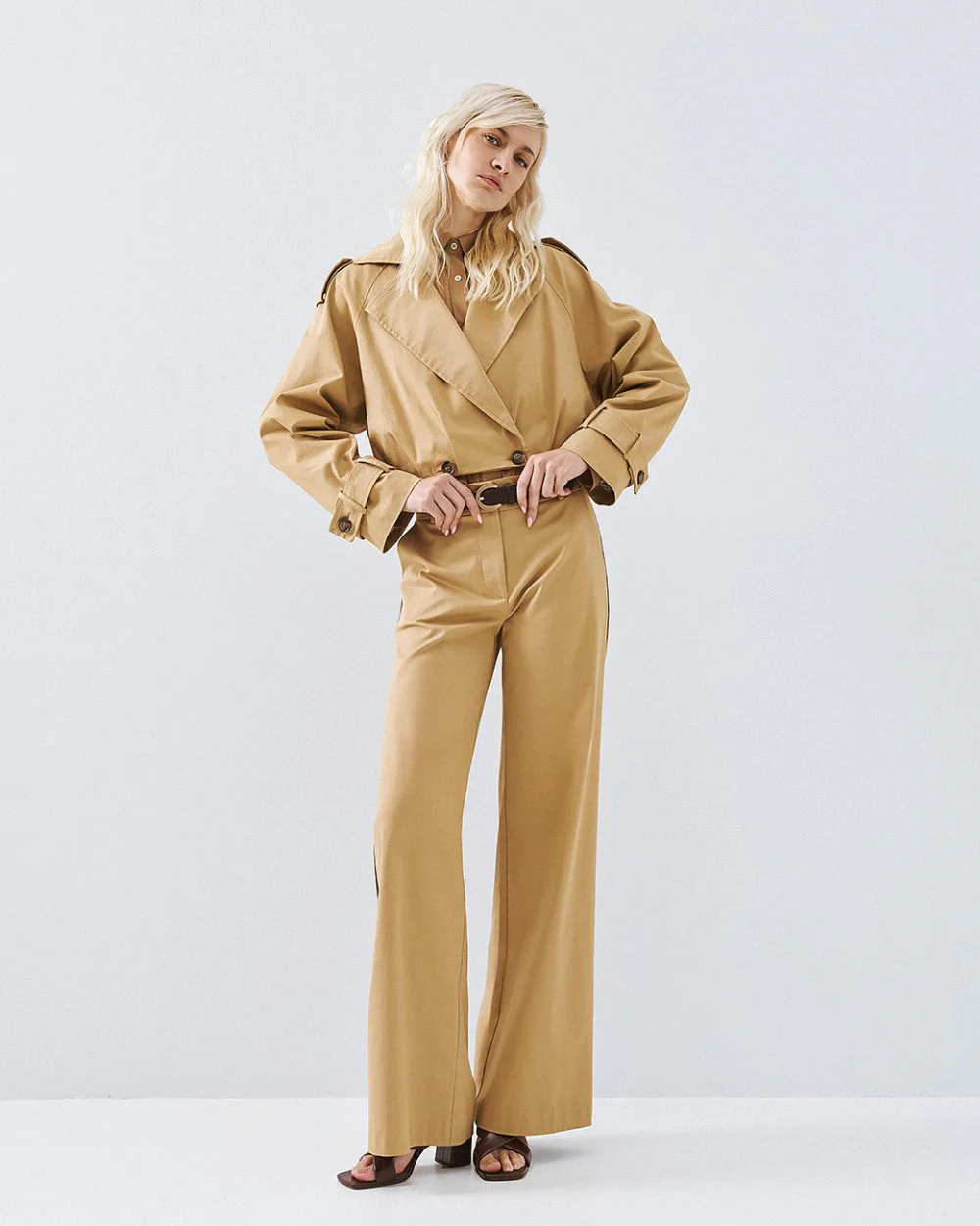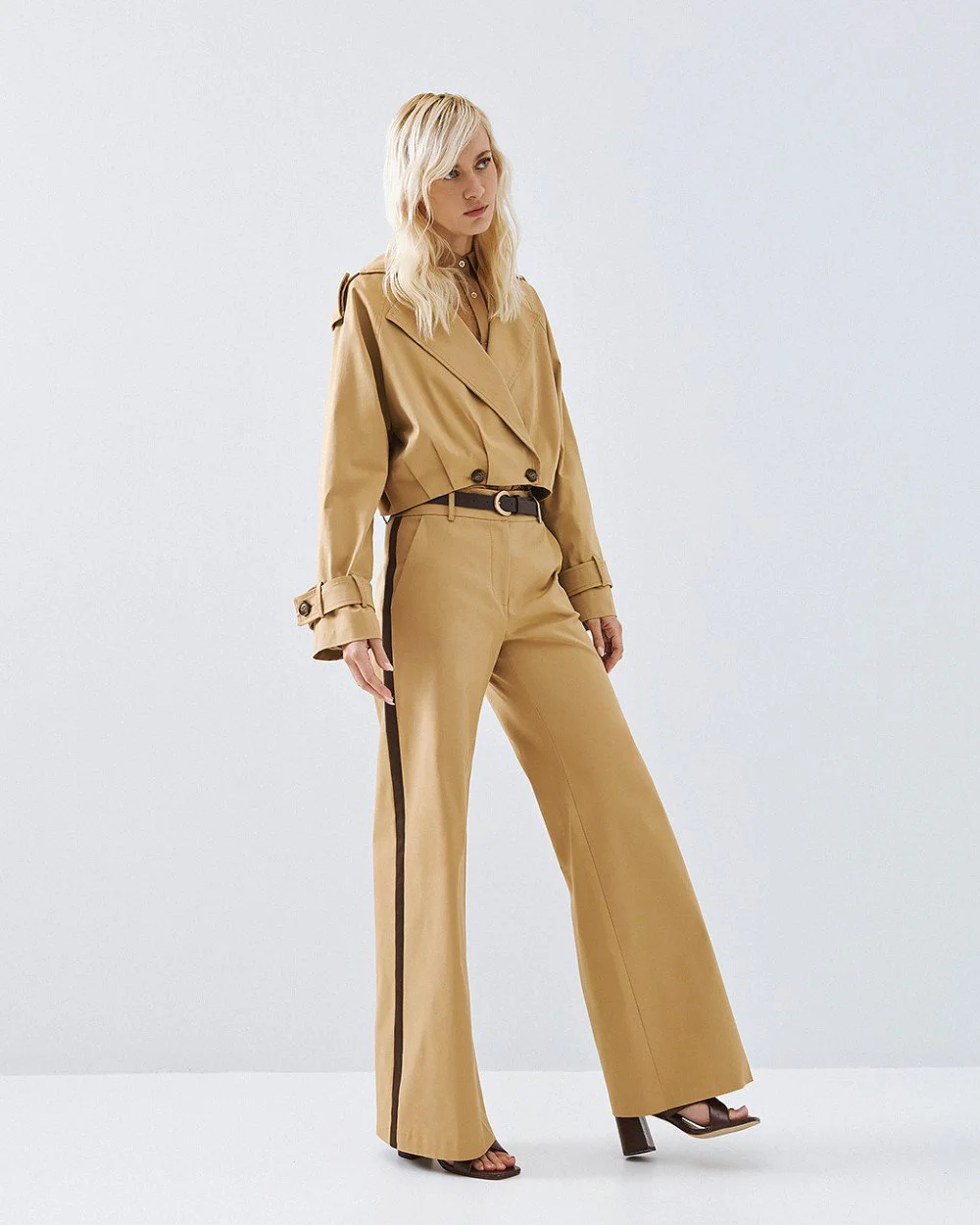 High-waisted wide-leg pants with side stripe details and belt loops. Feature side pockets, decorative welt pockets at the back and a zip and button fastening at the front.