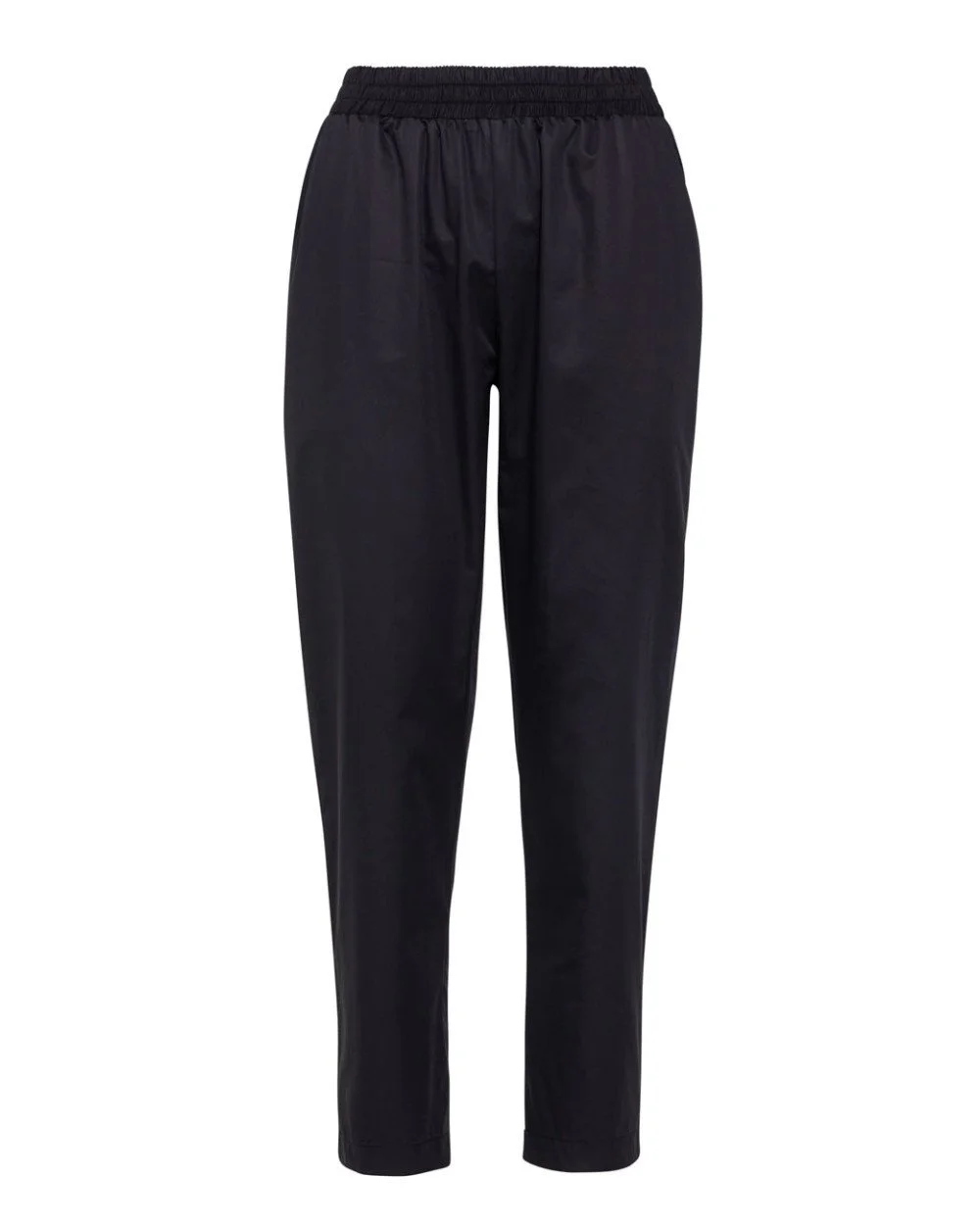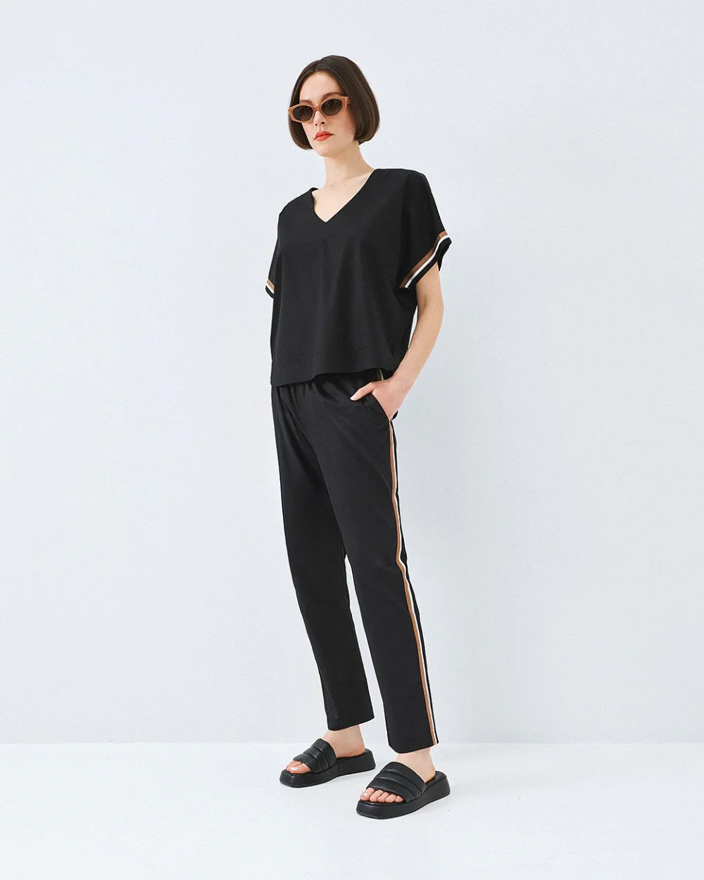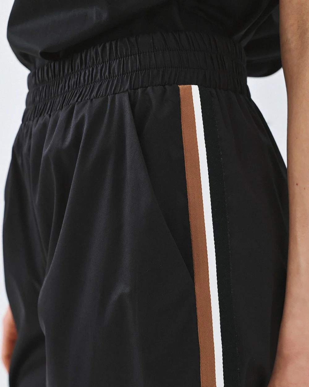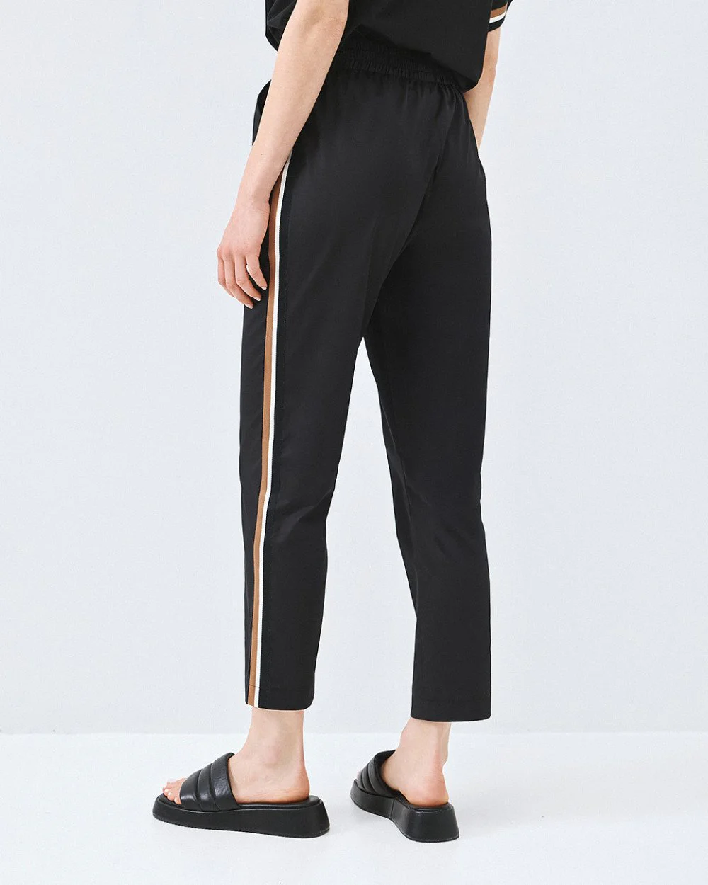 These trousers feature tapered silhouette the elasticated waistband ensures a flexible and comfortable fit. A subtle yet stylish contrast side stripe in warm neutral tones runs along the outer seam.